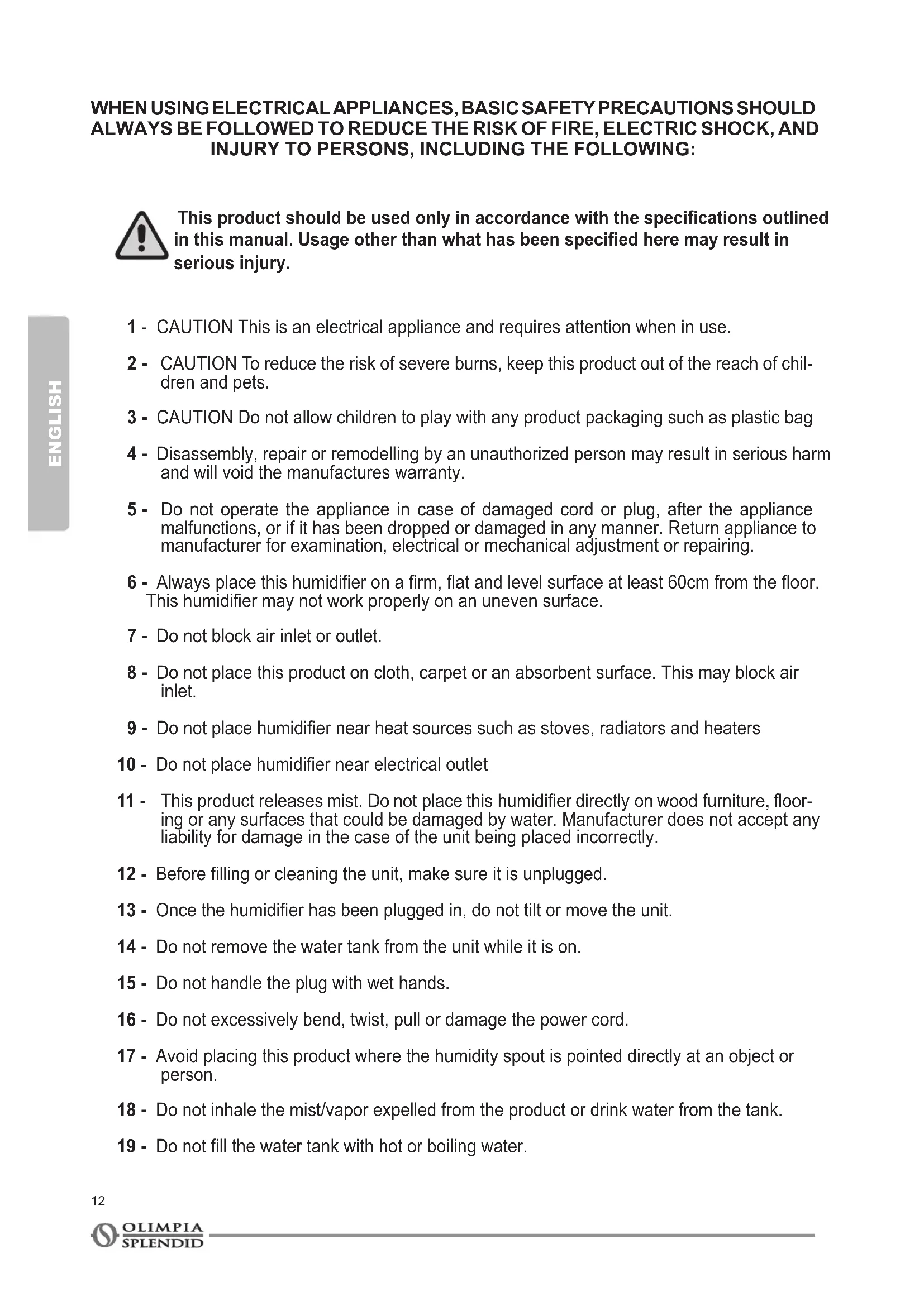 11 - This product releases mist. Do not place this humidier directly on wood furniture, oor-