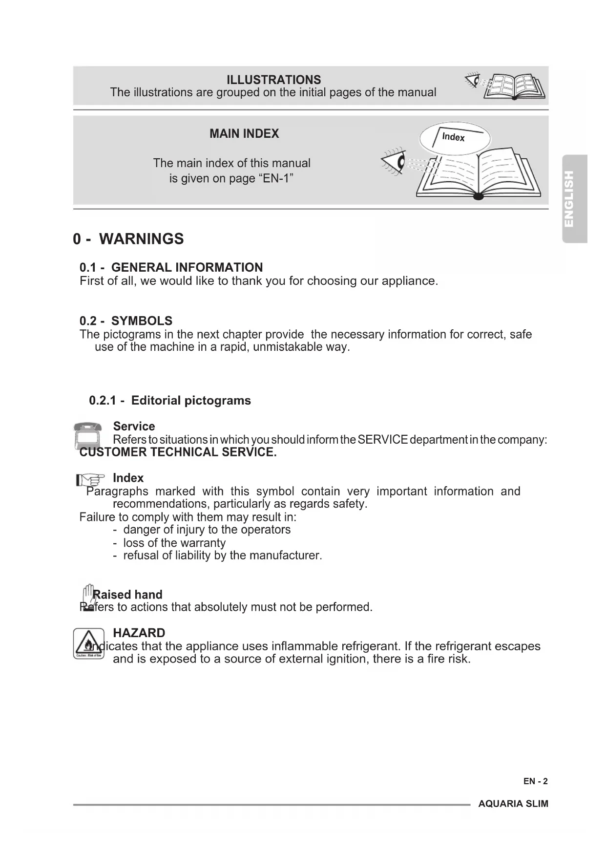Service Refers to situations in which you should inform the SERVICE department in the company: CUSTOMER TECHNICAL SERVICE. Index Paragraphs marked with this symbol contain very important information and recommendations, particularly as regards safety. Failure to comply with them may result in: - danger of injury to the operators - loss of the warranty - refusal of liability by the manufacturer. Raised hand Refers to actions that absolutely must not be performed. HAZARD Indicatesthattheapplianceusesinammablerefrigerant.Iftherefrigerantescapes andisexposedtoasourceofexternalignition,thereisarerisk. Index MAIN INDEX The main index of this manual is given on page “EN-1” ILLUSTRATIONS The illustrations are grouped on the initial pages of the manualENGLISH EN - 3
