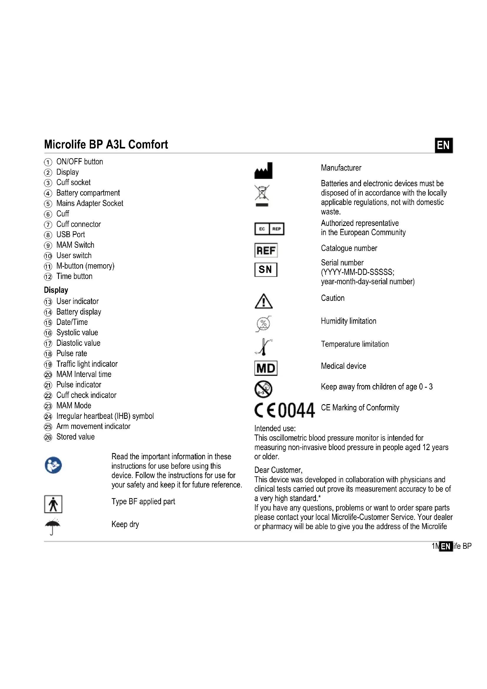 1 ON/OFF button 2 Display 3 Cuff socket 4 Battery compartment 5 Mains Adapter Socket 6 Cuff 7 Cuff connector 8 USB Port 9 MAM Switch AT User switch AK M-button (memory) AL Time button AM User indicator AN Battery display AO Date/Time AP Systolic value AQ Diastolic value AR Pulse rate AS Traffic light indicator BT MAM Interval time BK Pulse indicator BL Cuff check indicator BM MAM Mode BN Irregular heartbeat (IHB) symbol BO Arm movement indicator BP Stored value Read the important information in these instructions for use before using this device. Follow the instructions for use for your safety and keep it for future reference. Type BF applied part Keep dry Manufacturer Batteries and electronic devices must be disposed of in accordance with the locally applicable regulations, not with domestic waste. Authorized representative in the European Community Catalogue number Serial number (YYYY-MM-DD-SSSSS; year-month-day-serial number) Caution Humidity limitation Temperature limitation Medical device Keep away from children of age 0 - 3 CE Marking of Conformity