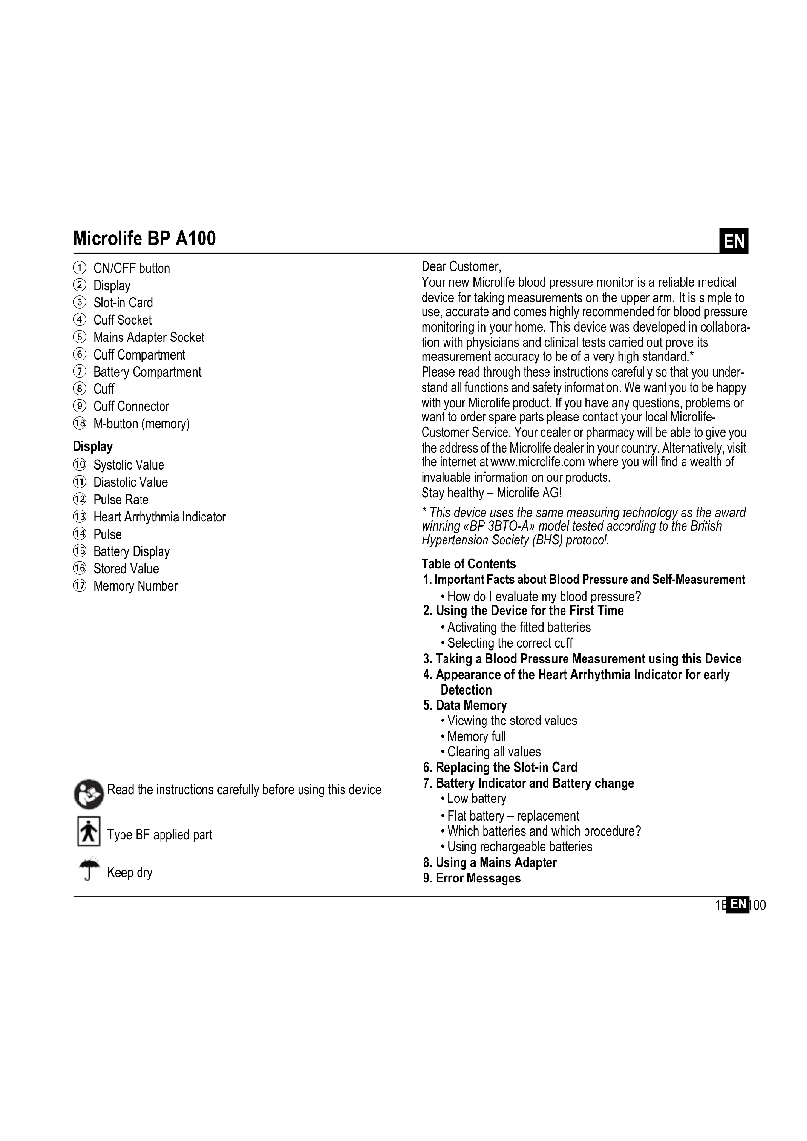 Display Read the instructions carefully before using this device. Type BF applied part Dear Customer, Your new Microlife blood pressure monitor is a reliable medical device for taking measurements on the upper arm. It is simple to use, accurate and comes highly recommended for blood pressure monitoring in your home. This device was developed in collabora- tion with physicians and clinical tests carried out prove its measurement accuracy to be of a very high standard.* Please read through these instructions carefully so that you under- stand all functions and safety information. We want you to be happy with your Microlife product. If you have any questions, problems or want to order spare parts please contact your local Microlife
