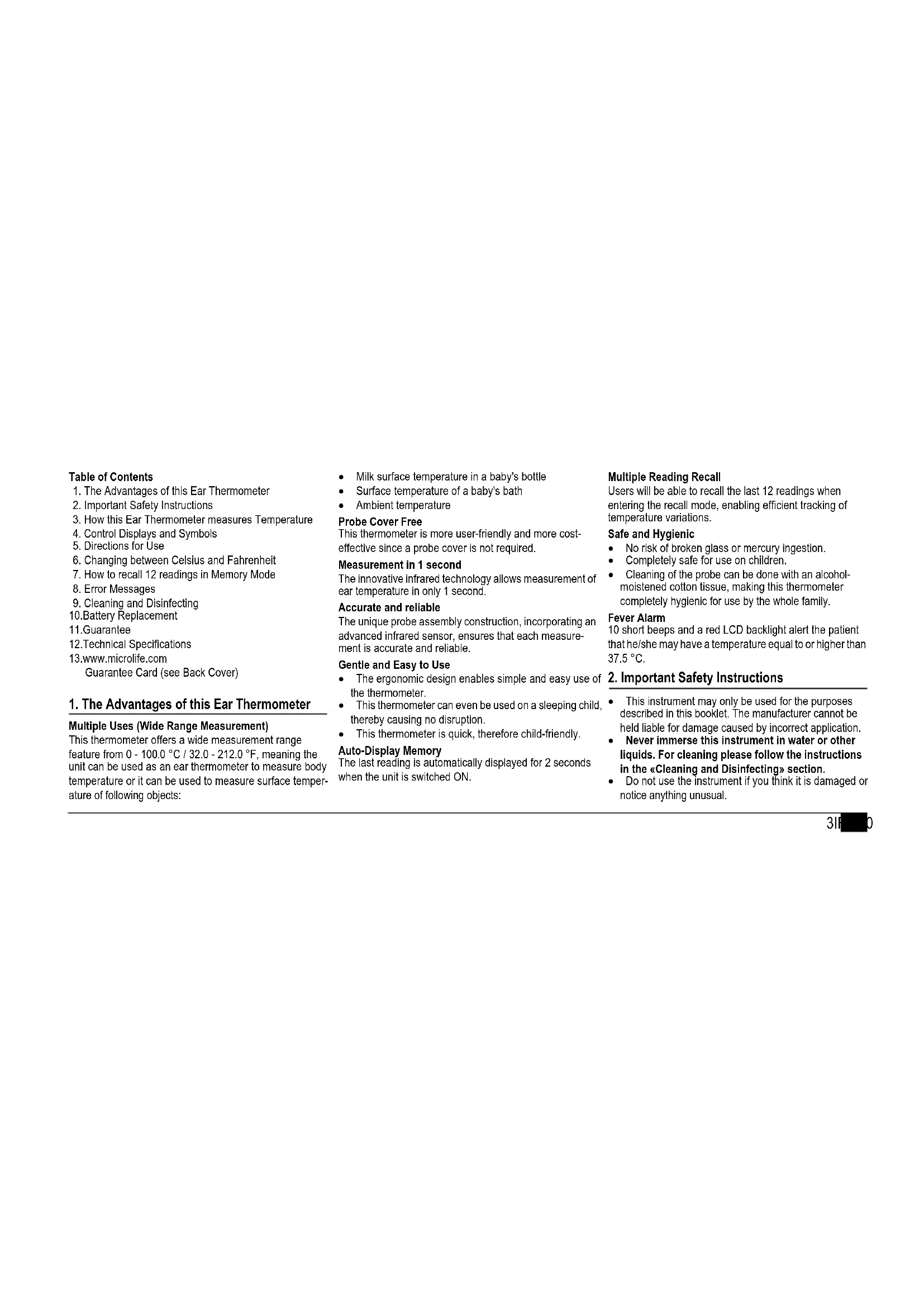 Multiple Uses (Wide Range Measurement) This thermometer offers a wide measurement range feature from 0 - 100.0 °C / 32.0 - 212.0 °F, meaning the unit can be used as an ear thermometer to measure body temperature or it can be used to measure surface temper- ature of following objects: Milk surface temperature in a baby's bottle Surface temperature of a baby's bath Ambient temperature Probe Cover Free This thermometer is more user-friendly and more cost- effective since a probe cover is not required. Measurement in 1 second The innovative infrared technology allows measurement of ear temperature in only 1 second. Accurate and reliable The unique probe assembly construction, incorporating an advanced infrared sensor, ensures that each measure- ment is accurate and reliable. Gentle and Easy to Use The ergonomic design enables simple and easy use of the thermometer. This thermometer can even be used on a sleeping child, thereby causing no disruption. This thermometer is quick, therefore child-friendly. Auto-Display Memory The last reading is automatically displayed for 2 seconds when the unit is switched ON. Multiple Reading Recall Users will be able to recall the last 12 readings when entering the recall mode, enabling efficient tracking of temperature variations. Safe and Hygienic No risk of broken glass or mercury ingestion. Completely safe for use on children. Cleaning of the probe can be done with an alcohol- moistened cotton tissue, making this thermometer completely hygienic for use by the whole family. Fever Alarm 10 short beeps and a red LCD backlight alert the patient that he/she may have a temperature equal to or higher than