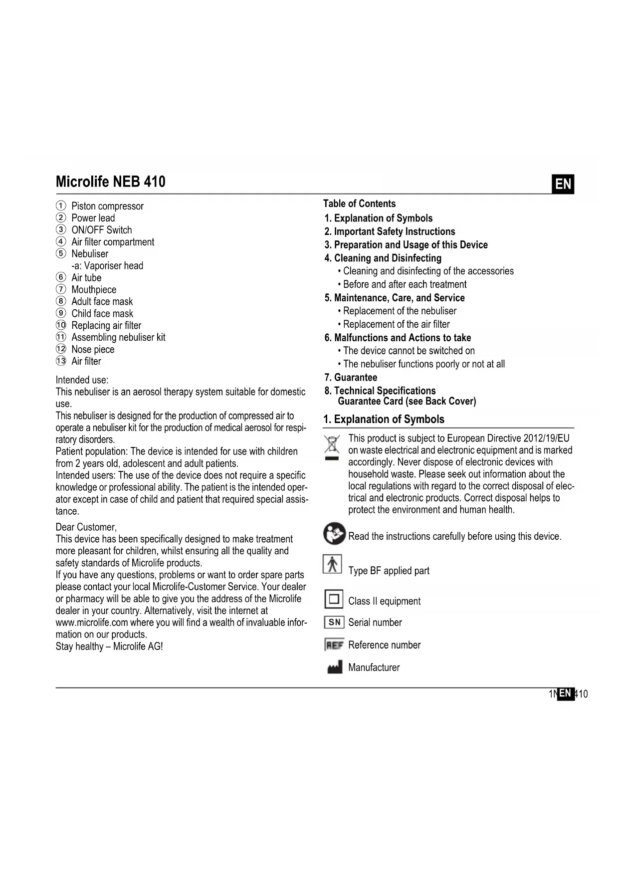This device is covered by a 5 year guarantee from the date of purchase. During this guarantee period, at our discretion, Microlife will repair or replace the defective product free of charge. Opening or altering the device invalidates the guarantee. The following items are excluded from the guarantee: Transport costs and risks of transport. Damage caused by incorrect application or non-compliance with the instructions for use. Damage caused by leaking batteries. Damage caused by accident or misuse. Packaging/storage material and instructions for use. Regular checks and maintenance (calibration). Accessories and wearing parts: Nebuliser, masks, mouthpiece, nose piece, tube, filters, nasal washer (optional). Should guarantee service be required, please contact the dealer from where the product was purchased, or your local Microlife service. You may contact your local Microlife service through our website: www.microlife.com/support Compensation is limited to the value of the product. The guarantee will be granted if the complete product is returned with the original invoice. Repair or replacement within guarantee does not prolong or renew the guarantee period. The legal claims and rights of consumers are not limited by this guarantee.5NEB 410