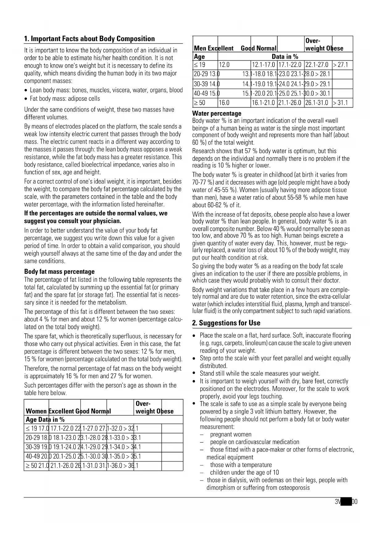 It is important to know the body composition of an individual in order to be able to estimate his/her health condition. It is not enough to know one's weight but it is necessary to define its quality, which means dividing the human body in its two major component masses: Under the same conditions of weight, these two masses have different volumes. By means of electrodes placed on the platform, the scale sends a weak low intensity electric current that passes through the body mass. The electric current reacts in a different way according to the masses it passes through: the lean body mass opposes a weak resistance, while the fat body mass has a greater resistance. This body resistance, called bioelectrical impedance, varies also in function of sex, age and height. For a correct control of one's ideal weight, it is important, besides the weight, to compare the body fat percentage calculated by the scale, with the parameters contained in the table and the body water percentage, with the information listed hereinafter. If the percentages are outside the normal values, we suggest you consult your physician. In order to better understand the value of your body fat percentage, we suggest you write down this value for a given period of time. In order to obtain a valid comparison, you should weigh yourself always at the same time of the day and under the same conditions. Body fat mass percentage The percentage of fat listed in the following table represents the total fat, calculated by summing up the essential fat (or primary fat) and the spare fat (or storage fat). The essential fat is neces- sary since it is needed for the metabolism. The percentage of this fat is different between the two sexes: about 4 % for men and about 12 % for women (percentage calcu- lated on the total body weight). The spare fat, which is theoretically superfluous, is necessary for those who carry out physical activities. Even in this case, the fat percentage is different between the two sexes: 12 % for men, 15 % for women (percentage calculated on the total body weight). Therefore, the normal percentage of fat mass on the body weight is approximately 16 % for men and 27 % for women. Such percentages differ with the person's age as shown in the table here below. Water percentage Body water % is an important indication of the overall «well being» of a human being as water is the single most important component of body weight and represents more than half (about 60 %) of the total weight. Research shows that 57 % body water is optimum, but this depends on the individual and normally there is no problem if the reading is 10 % higher or lower. The body water % is greater in childhood (at birth it varies from 70-77 %) and it decreases with age (old people might have a body water of 45-55 %). Women (usually having more adipose tissue than men), have a water ratio of about 55-58 % while men have about 60-62 % of it. With the increase of fat deposits, obese people also have a lower body water % than lean people. In general, body water % is an overall composite number. Below 40 % would normally be seen as too low, and above 70 % as too high. Human beings excrete a given quantity of water every day. This, however, must be regu- larly replaced, a water loss of about 10 % of the body weight, may put our health condition at risk. So giving the body water % as a reading on the body fat scale gives an indication to the user if there are possible problems, in which case they would probably wish to consult their doctor. Body weight variations that take place in a few hours are comple- tely normal and are due to water retention, since the extra-cellular water (which includes interstitial fluid, plasma, lymph and transcel- lular fluid) is the only compartment subject to such rapid variations.