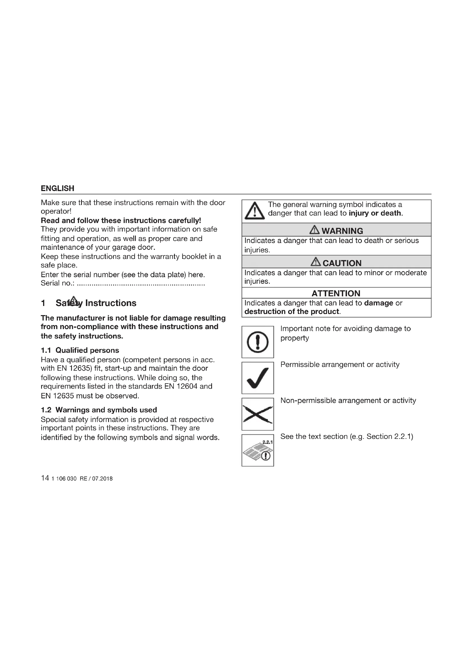 Dissemination as well as duplication of this document and the use and communication of its content are prohibited unless explicitly permitted. Noncompliance will result in damage compensation obligations. All rights reserved in the event of patent, utility model or design model registration. Subject to changes. ENGLISH14 1 106 030 RE / 07.2018 Make sure that these instructions remain with the door operator! Read and follow these instructions carefully! They provide you with important information on safe fitting and operation, as well as proper care and maintenance of your garage door. Keep these instructions and the warranty booklet in a safe place. Enter the serial number (see the data plate) here. Serial no.: ............................................................. 1 Safety Instructions The manufacturer is not liable for damage resulting from non-compliance with these instructions and the safety instructions.