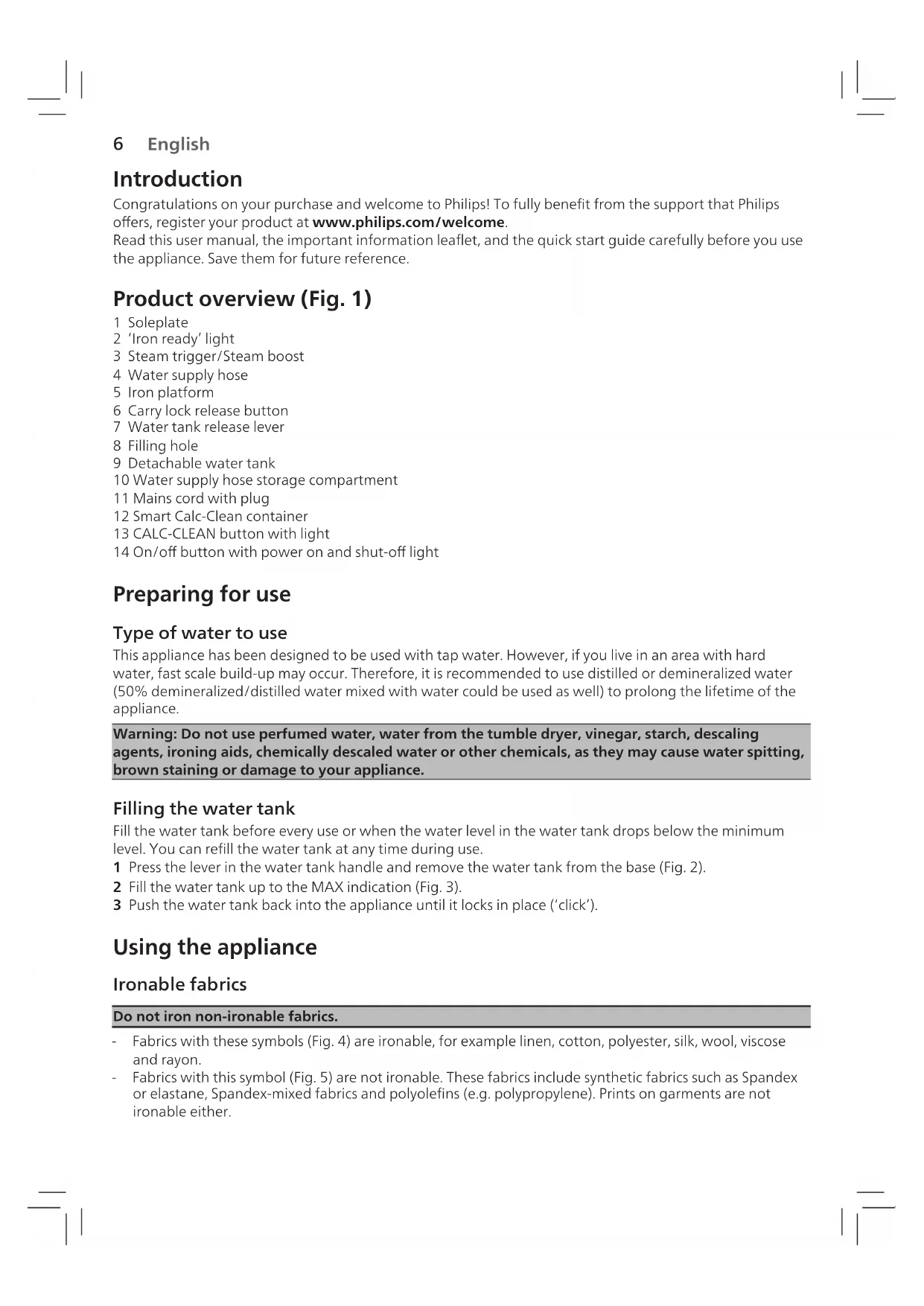 agents, ironing aids, chemically descaled water or other chemicals, as they may cause water spitting, brown staining or damage to your appliance. Filling the water tank Fill the water tank before every use or when the water level in the water tank drops below the minimum level. You can rell the water tank at any time during use. 1 Press the lever in the water tank handle and remove the water tank from the base )Fig. 2(. 2 Fill the water tank up to the MAX indication )Fig. 3(. 3 Push the water tank back into the appliance until it locks in place )‘click’(. Using the appliance Ironable fabrics Do not iron non-ironable fabrics. - Fabrics with these symbols )Fig. 4( are ironable, for example linen, cotton, polyester, silk, wool, viscose and rayon. - Fabrics with this symbol )Fig. 5( are not ironable. These fabrics include synthetic fabrics such as Spandex or elastane, Spandex-mixed fabrics and polyolens )e.g. polypropylene(. Prints on garments are not ironable either. English7 Ironing 1 Place the appliance on a stable and even surface. Note: In order to ensure safe ironing we recommend to always place the base on a stable ironing board, a table, or the oor. 2 Make sure that there is enough water in the water tank. 3 Remove the water supply hose from the storage compartment. 4 Put the mains plug in an earthed wall socket and press the on/o button to switch on the appliance )Fig. 6(. Wait until the ‘iron ready’ light lights up continuously )Fig. 7(. This takes about 2 minutes. 5 Press the carry lock release button to unlock the iron from the iron platform )Fig. 8(. 6 Press and hold the steam trigger to start ironing (Fig. 9). Note: When you start your ironing session and especially during the rst usage of steam trigger, it may take more than 30 seconds for steam to come out of the appliance. Note: The pump is activated each time you press the steam trigger. It produces subtle rattling sound. When there is no water in the water tank, the pump sound is louder. 7 For best ironing results, after ironing with steam, perform the last strokes without steam. Note: If you do not release the trigger early enough and lift the iron to the base, you might notice that steam still comes out, which is normal. To avoid that eect, we recommand you to leave the iron on the board while rearranging the garment.