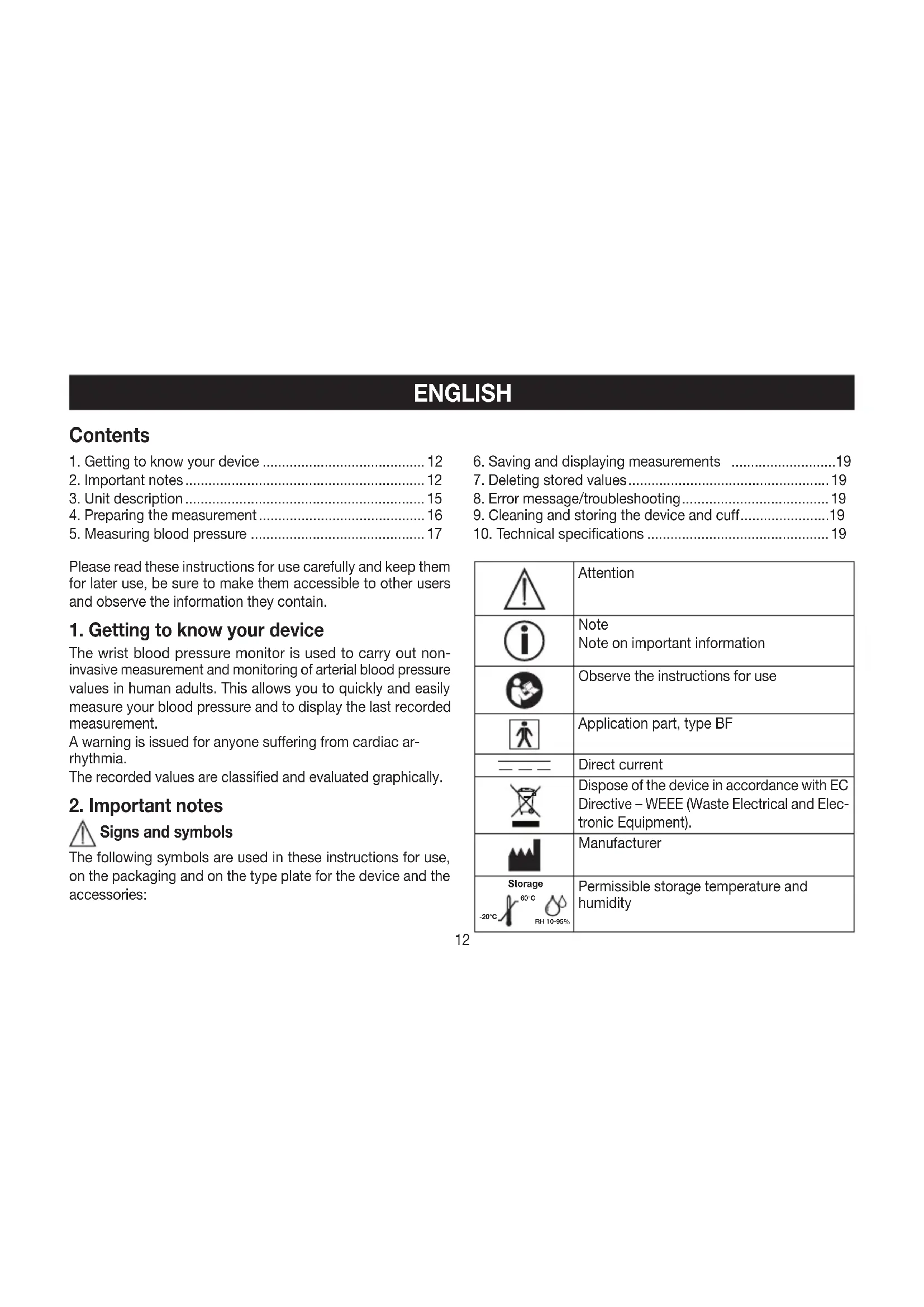 Signs and symbols The following symbols are used in these instructions for use, on the packaging and on the type plate for the device and the accessories: Attention Note Note on important information Observe the instructions for use Application part, type BF Direct current Dispose of the device in accordance with EC Directive – WEEE (Waste Electrical and Elec- tronic Equipment). Manufacturer StorageRH 10-95%-20°C 60°C Permissible storage temperature and humidity ENGLISH