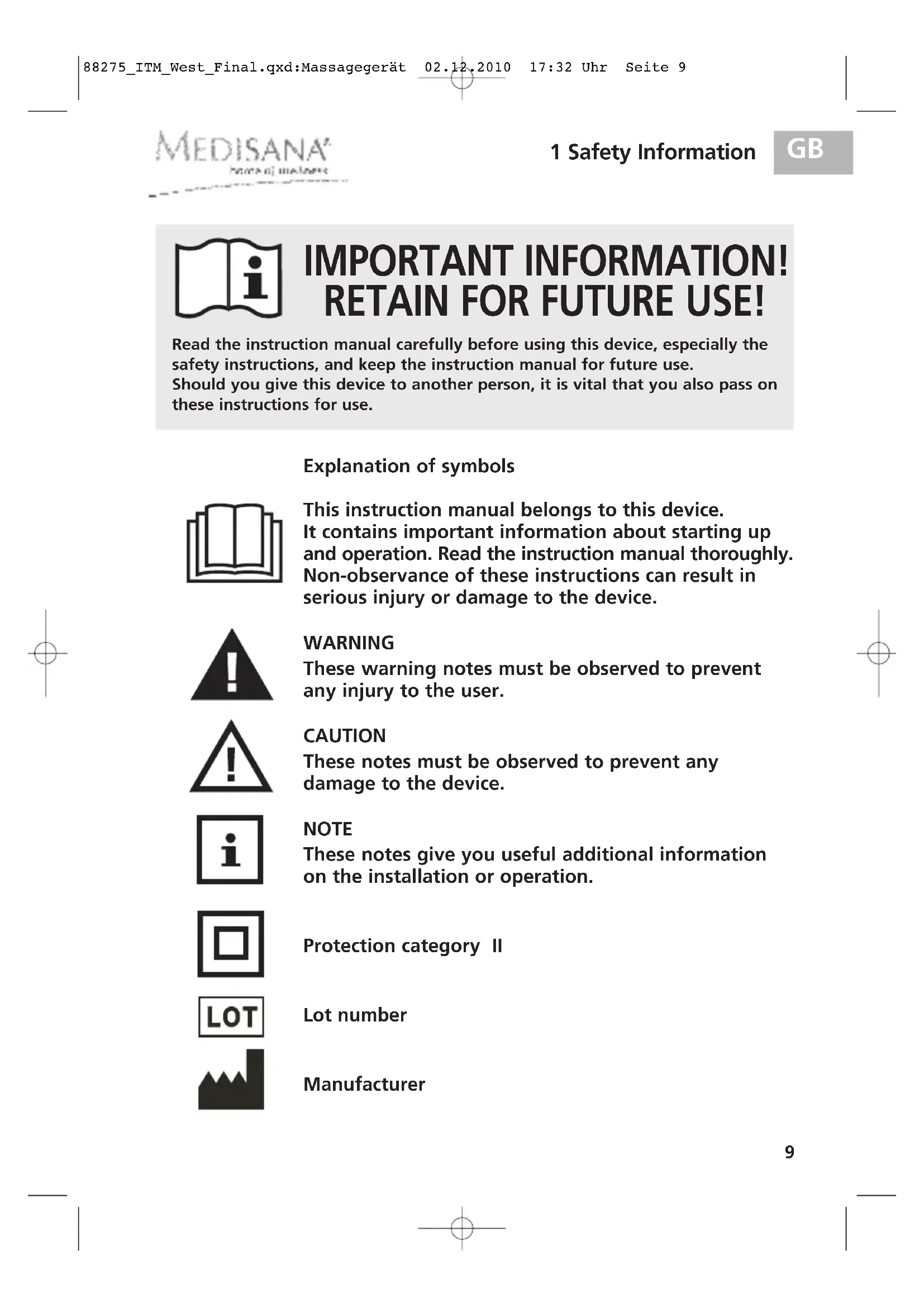 To ensure that you are able to obtain the results you are looking for and can enjoy using your MEDISANA massage device for a long time to come, we recommend that you read carefully the following information about the use and care of the device.