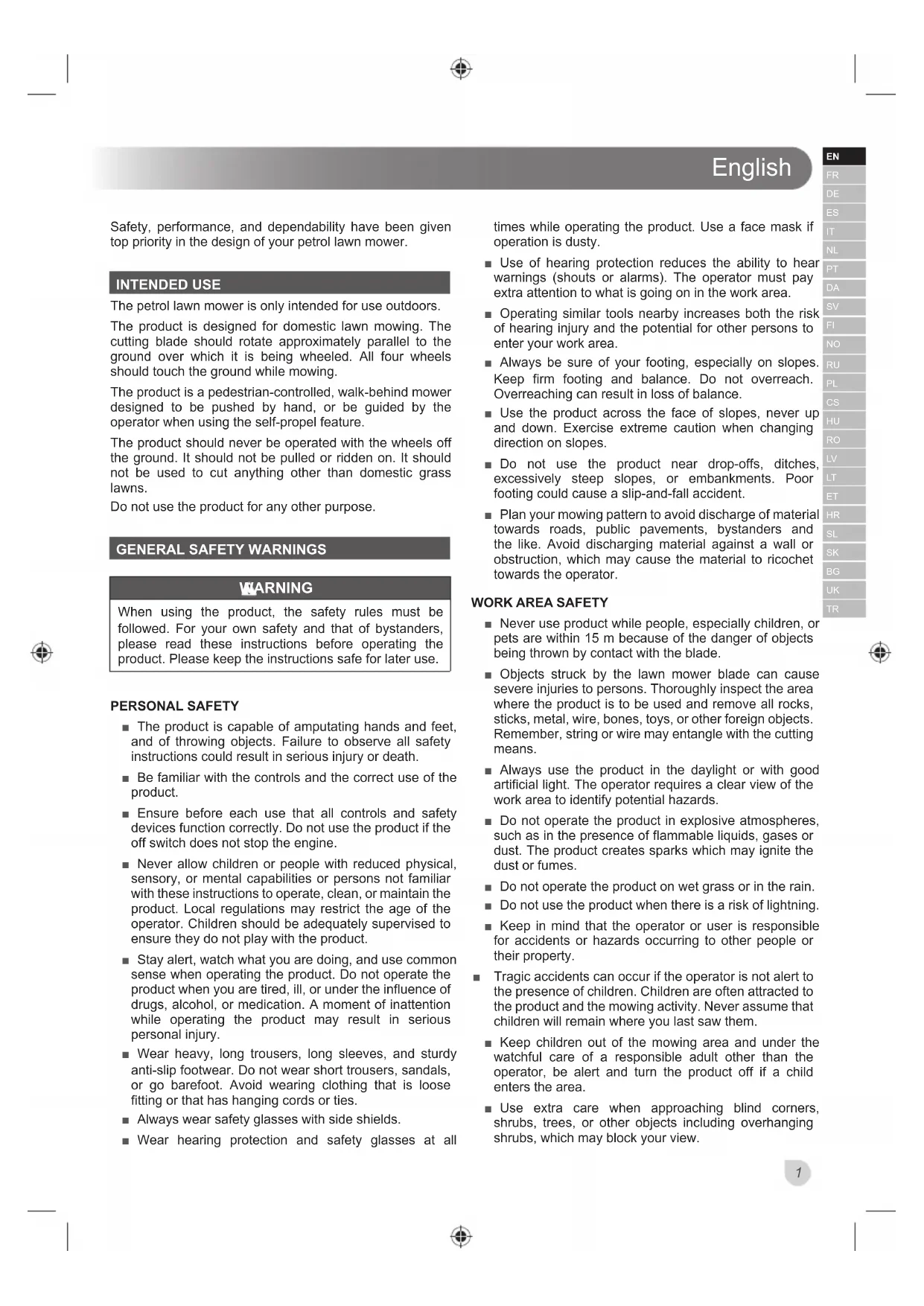 Safety, performance, and dependability have been given top priority in the design of your petrol lawn mower. INTENDED USE The petrol lawn mower is only intended for use outdoors. The product is designed for domestic lawn mowing. The cutting blade should rotate approximately parallel to the ground over which it is being wheeled. All four wheels should touch the ground while mowing. The product is a pedestrian-controlled, walk-behind mower designed to be pushed by hand, or be guided by the operator when using the self-propel feature. The product should never be operated with the wheels off the ground. It should not be pulled or ridden on. It should not be used to cut anything other than domestic grass lawns. Do not use the product for any other purpose.