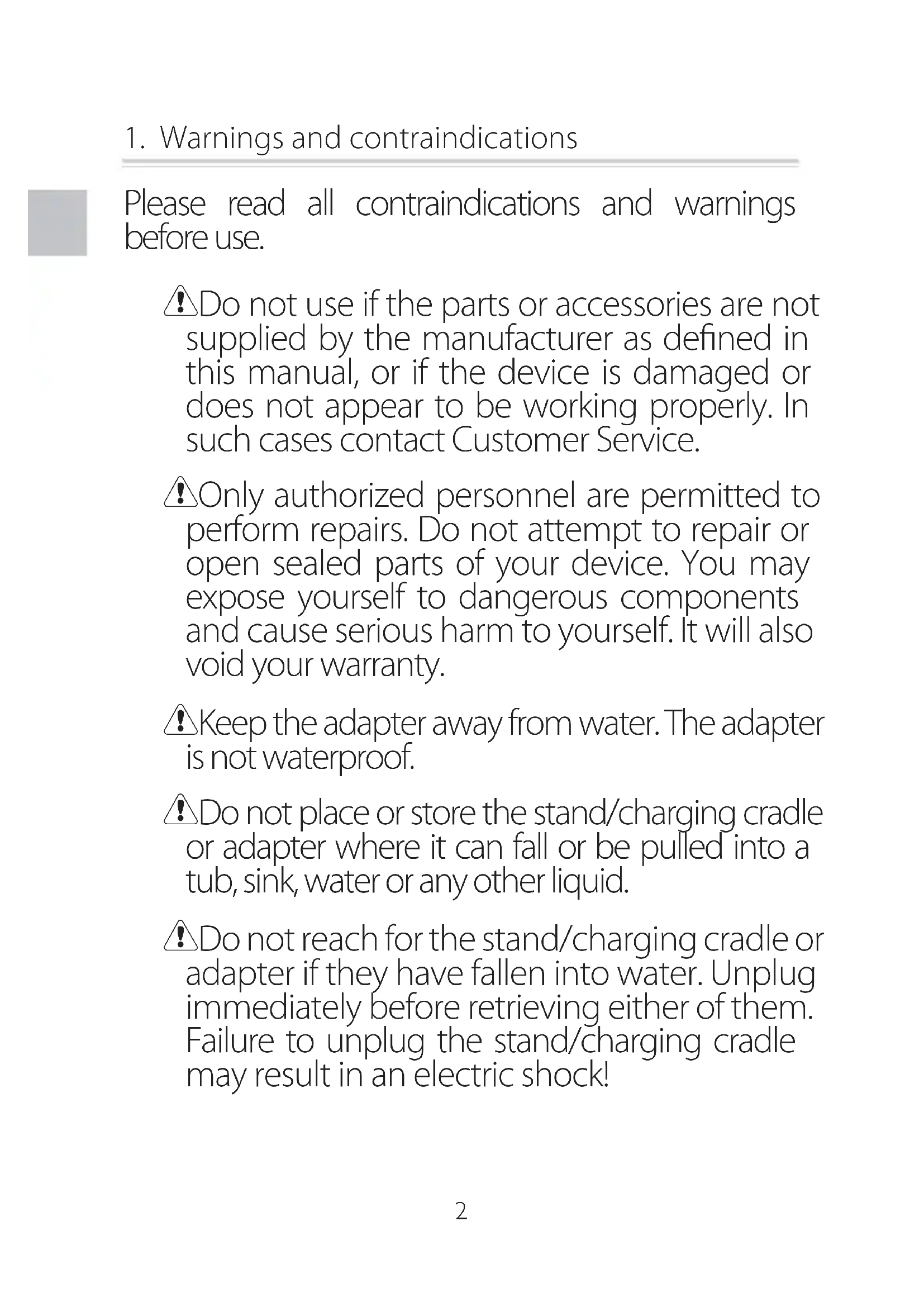 Do not reach for the stand/charging cradle or adapter if they have fallen into water. Unplug immediately before retrieving either of them. Failure to unplug the stand/charging cradle may result in an electric shock!