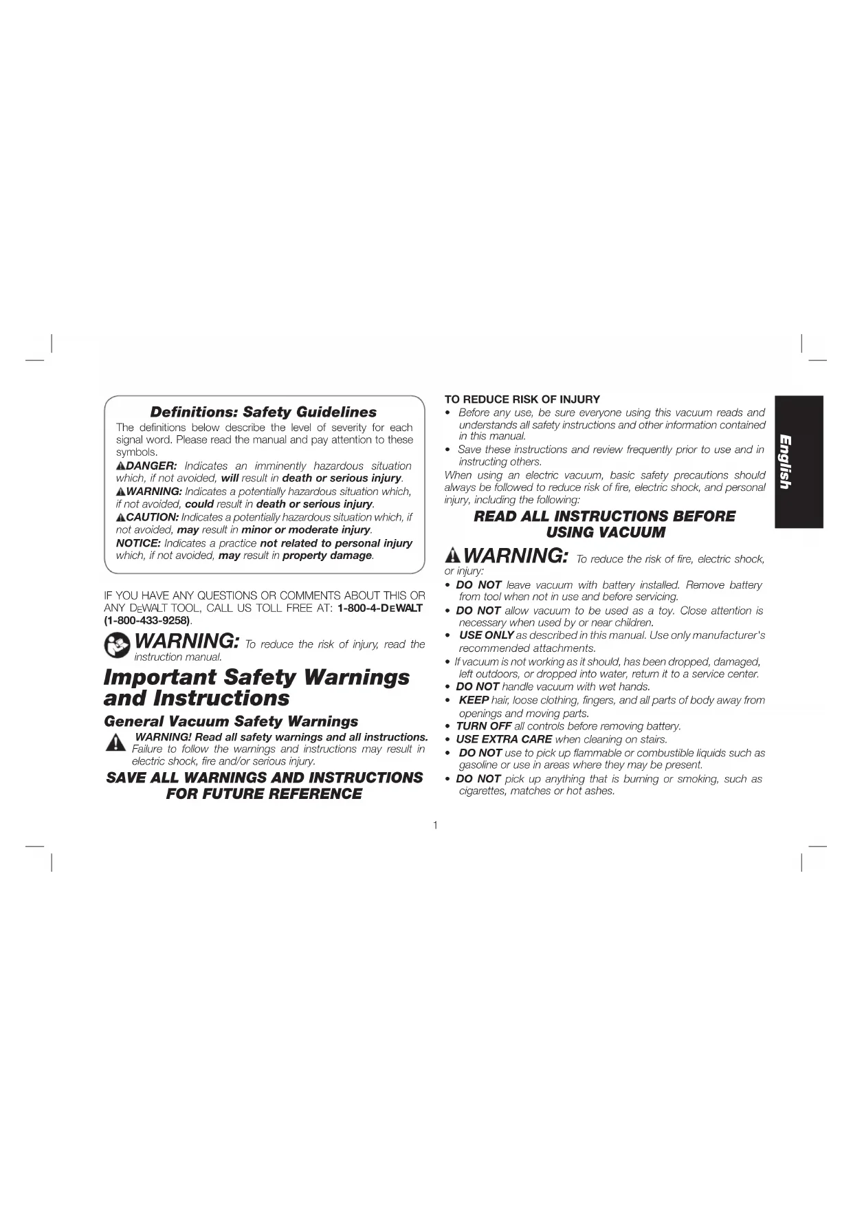 WALT • www.dewalt.com Page Size: 8.5 x 5.5"Definitions: Safety Guidelines The definitions below describe the level of severity for each signal word. Please read the manual and pay attention to these symbols.