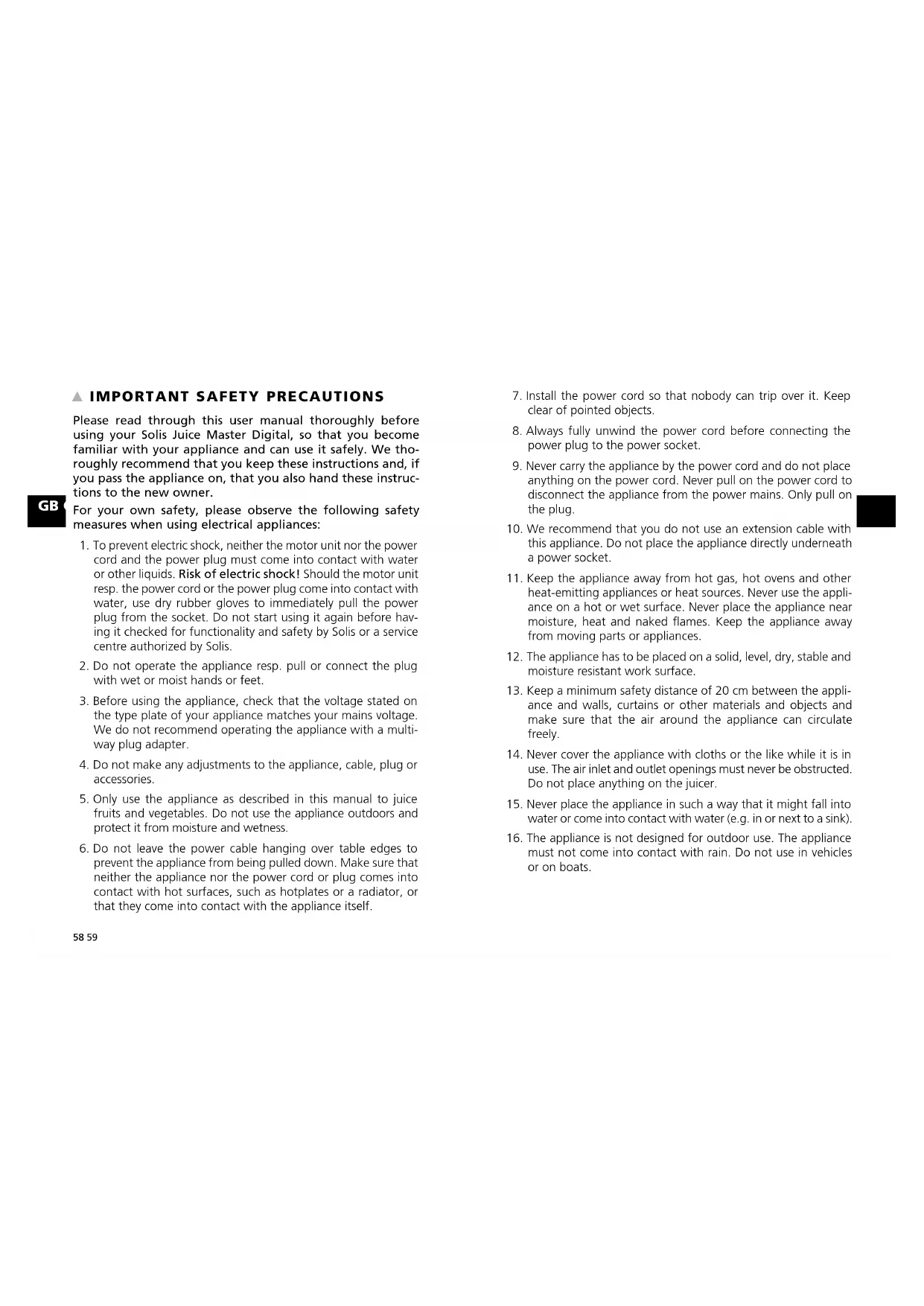 Please read through this user manual thoroughly before using your Solis Juice Master Digital, so that you become familiar with your appliance and can use it safely. We tho- roughly recommend that you keep these instructions and, if you pass the appliance on, that you also hand these instruc- tions to the new owner. For your own safety, please observe the following safety measures when using electrical appliances: