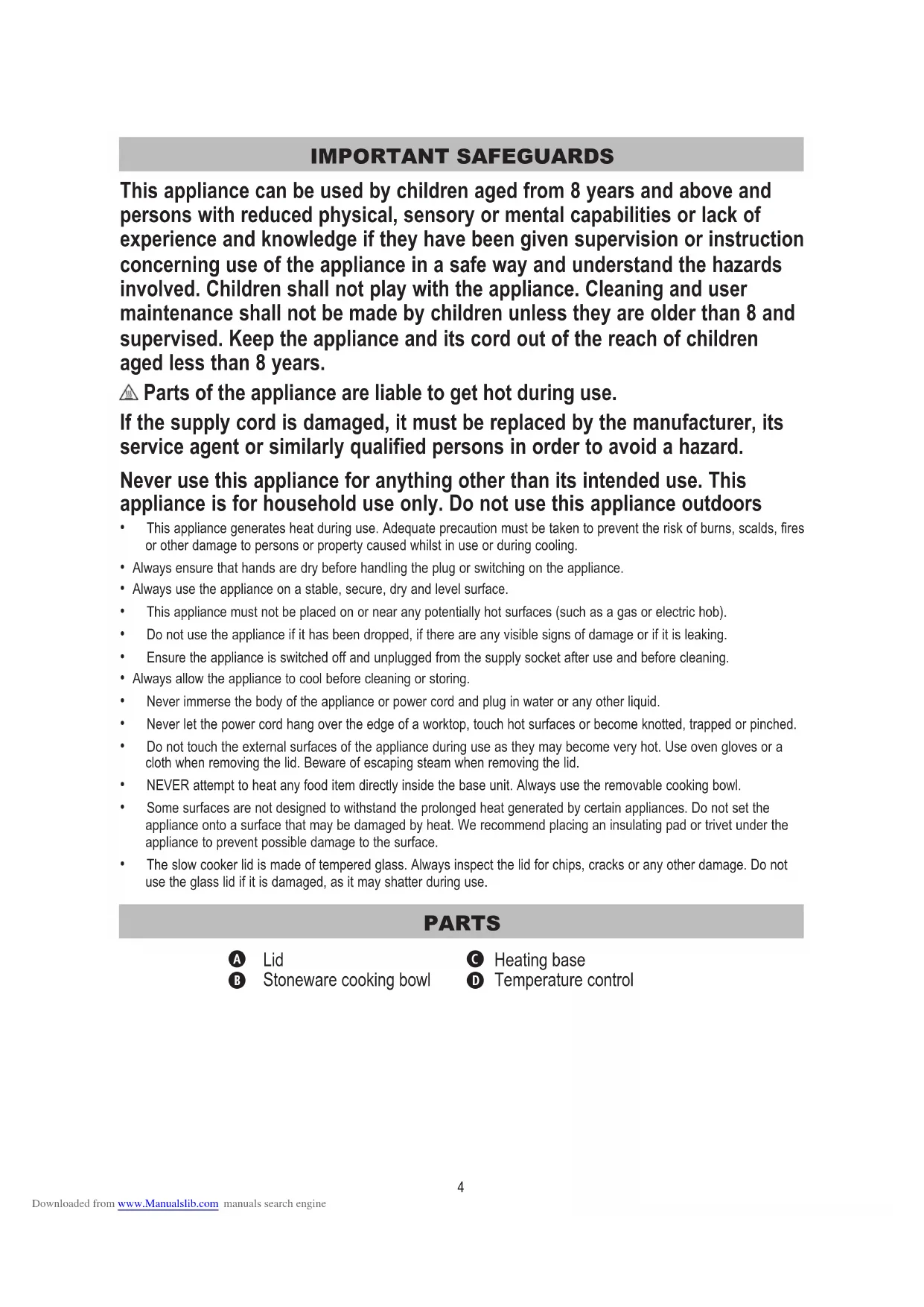 Downloaded from www.Manualslib.com manuals search engine4 IMPORTANT SAFEGUARDS This appliance can be used by children aged from 8 years and above and persons with reduced physical, sensory or mental capabilities or lack of experience and knowledge if they have been given supervision or instruction concerning use of the appliance in a safe way and understand the hazards involved. Children shall not play with the appliance. Cleaning and user maintenance shall not be made by children unless they are older than 8 and supervised. Keep the appliance and its cord out of the reach of children aged less than 8 years. Parts of the appliance are liable to get hot during use. If the supply cord is damaged, it must be replaced by the manufacturer, its service agent or similarly qualified persons in order to avoid a hazard. Never use this appliance for anything other than its intended use. This appliance is for household use only. Do not use this appliance outdoors