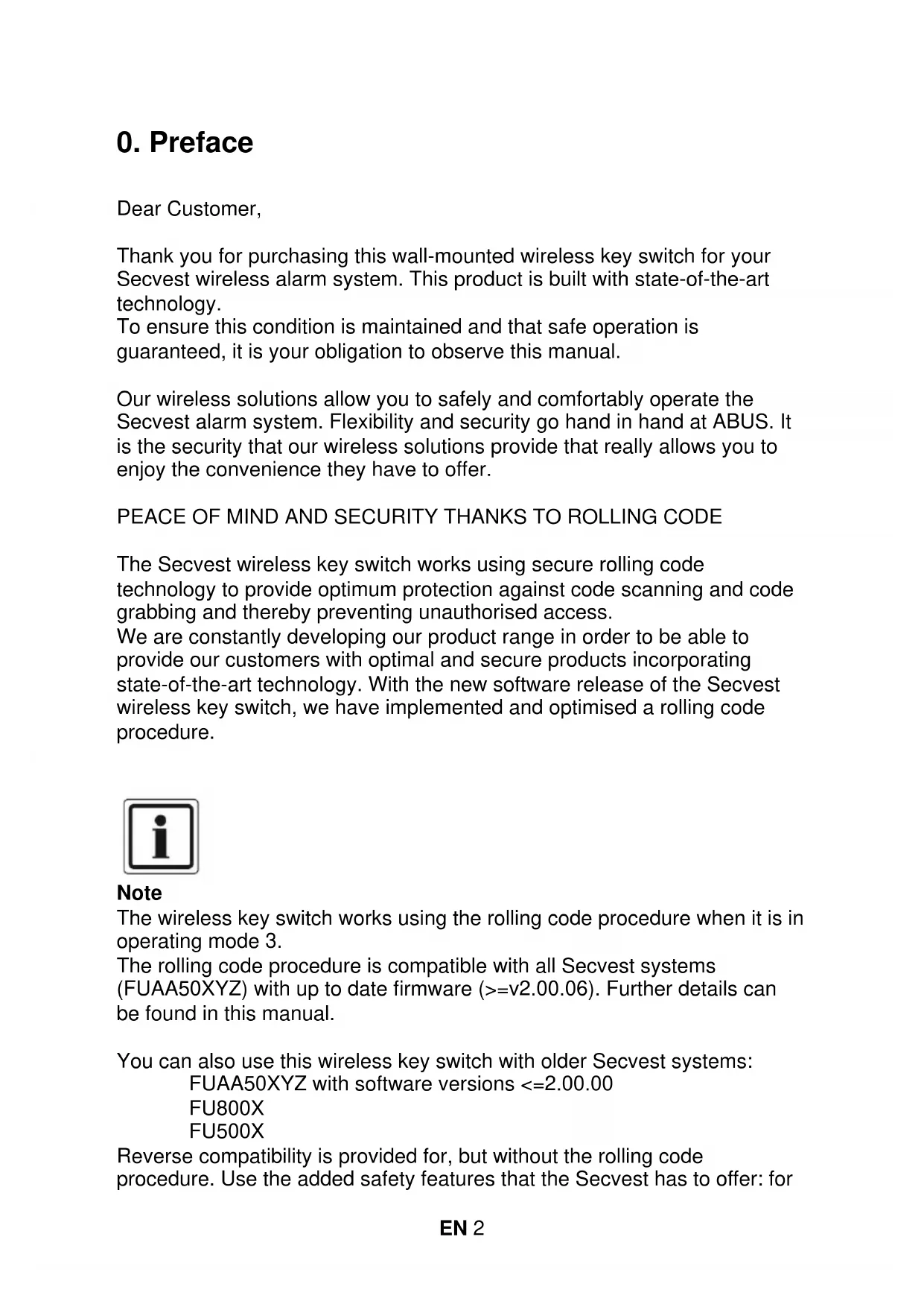 Dear Customer, Thank you for purchasing this wall-mounted wireless key switch for your Secvest wireless alarm system. This product is built with state-of-the-art technology. To ensure this condition is maintained and that safe operation is guaranteed, it is your obligation to observe this manual. Our wireless solutions allow you to safely and comfortably operate the Secvest alarm system. Flexibility and security go hand in hand at ABUS. It is the security that our wireless solutions provide that really allows you to enjoy the convenience they have to offer. PEACE OF MIND AND SECURITY THANKS TO ROLLING CODE The Secvest wireless key switch works using secure rolling code technology to provide optimum protection against code scanning and code grabbing and thereby preventing unauthorised access. We are constantly developing our product range in order to be able to provide our customers with optimal and secure products incorporating state-of-the-art technology. With the new software release of the Secvest wireless key switch, we have implemented and optimised a rolling code procedure.