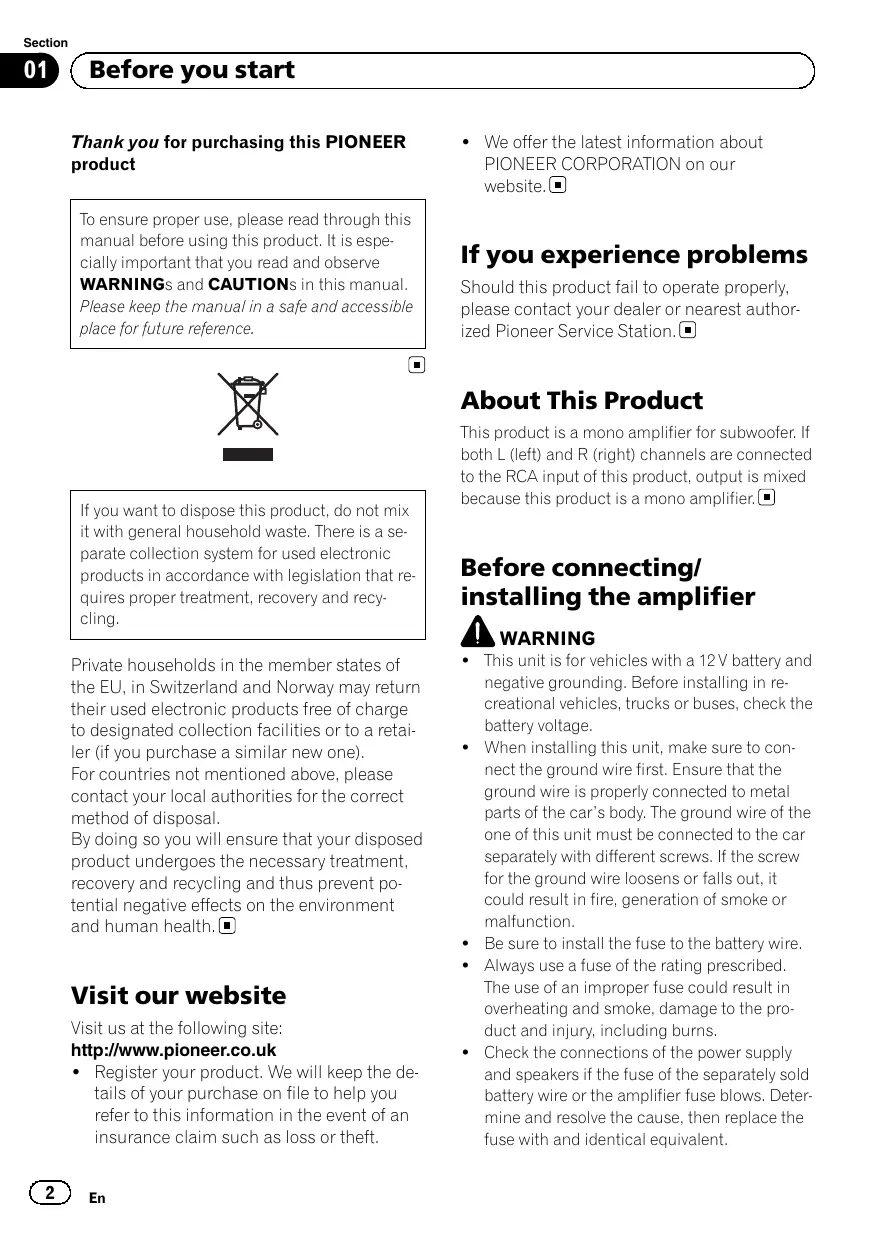 Before you start Thank you for purchasing this PIONEER product To ensure proper use, please read through this manual before using this product. It is especially important that you read and observe WARNINGs and CAUTIONs in this manual. Please keep the manual in a safe and accessible place for future reference. ! We offer the latest information about PIONEER CORPORATION on our website. If you experience problems Should this product fail to operate properly, please contact your dealer or nearest authorized Pioneer Service Station. About This Product If you want to dispose this product, do not mix it with general household waste. There is a separate collection system for used electronic products in accordance with legislation that requires proper treatment, recovery and recycling. This product is a mono amplifier for subwoofer. If both L (left) and R (right) channels are connected to the RCA input of this product, output is mixed because this product is a mono amplifier. Before connecting/ installing the amplifier WARNING Private households in the member states of the EU, in Switzerland and Norway may return their used electronic products free of charge to designated collection facilities or to a retailer (if you purchase a similar new one). For countries not mentioned above, please contact your local authorities for the correct method of disposal. By doing so you will ensure that your disposed product undergoes the necessary treatment, recovery and recycling and thus prevent potential negative effects on the environment and human health. Visit our website Visit us at the following site: http://www.pioneer.co.uk ! Register your product. We will keep the details of your purchase on file to help you refer to this information in the event of an insurance claim such as loss or theft.