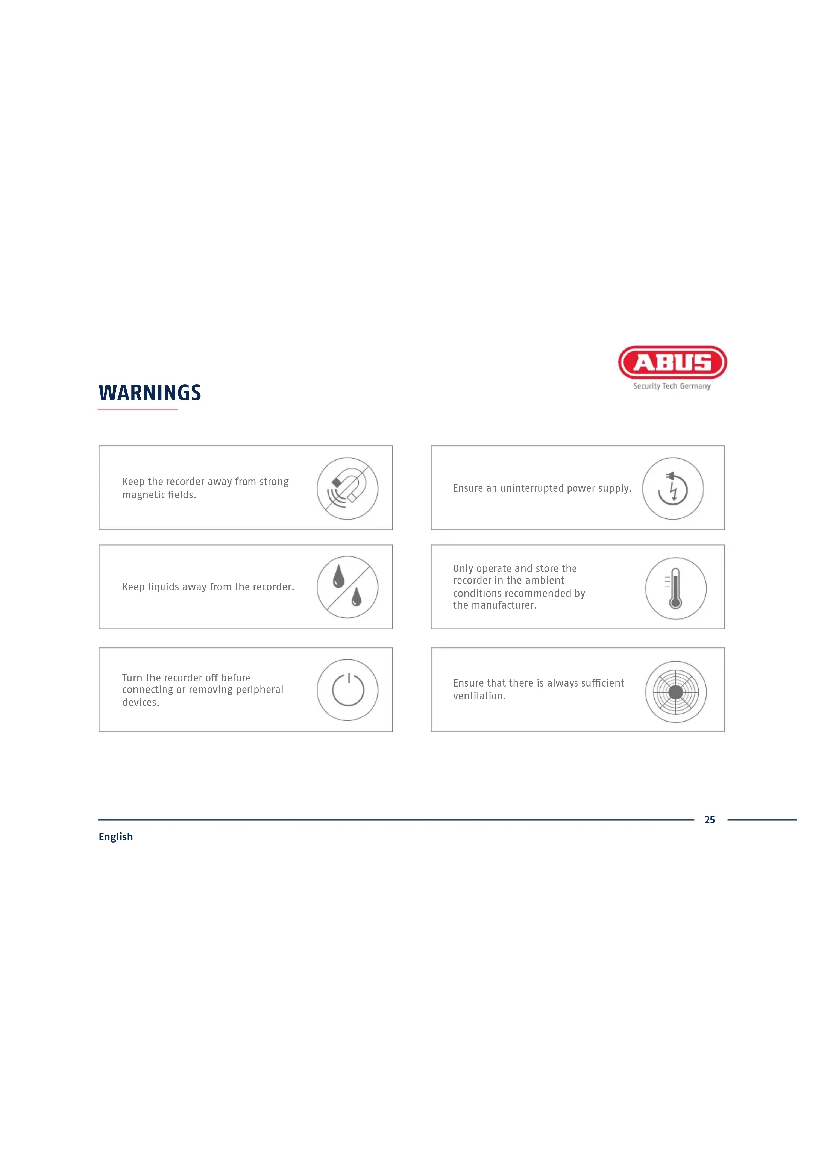 IP RECORDER This quick-start guide describes the initial installation steps for your IP recorder. More detailed information can be found in the user guide.23 English Dear Customer, Thank you for purchasing one of our products. This product complies with current European and national regulations. Conformity has been proven, and all related certications are available from the manufacturer on request: ABUS Security-Center GmbH & Co. KG, Linker Kreuthweg 5, 86444 Ang, GERMANY. To ensure that this standard is maintained and that safe operation is guaranteed, you are obliged to observe the stipulations set out in this user guide. Read the entire user guide before putting the product into operation, and pay attention to all operating instructions and safety information. All company names and product descriptions are trademarks of the corresponding owner. All rights reserved. If you have any questions, please contact your specialist dealer.24 English