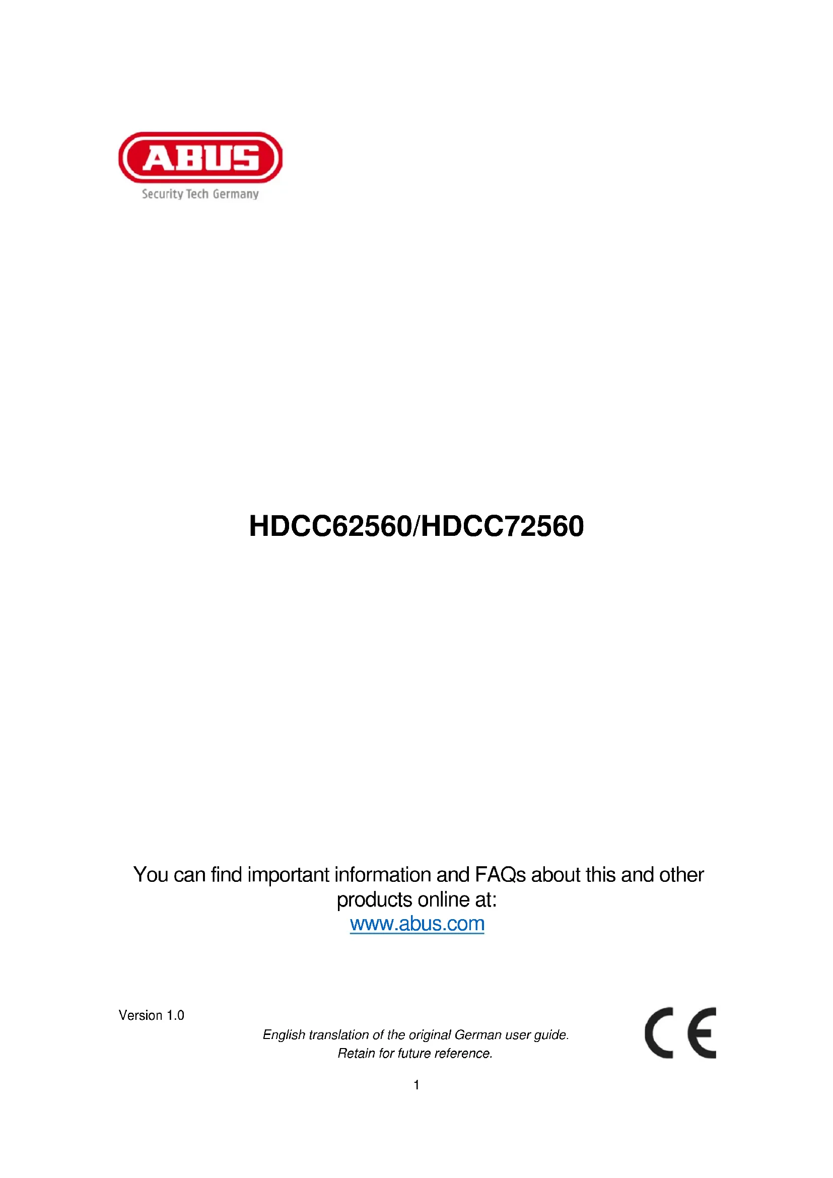 Version 1.0 English translation of the original German user guide. Retain for future reference.2 English Introduction Dear Customer, Thank you for purchasing this product. ABUS Security-Center hereby declares that the HDCC62560 and HDCC72560 cameras comply with the requirements of the following EU Directives: EMC Directive 2014/30/EU and the RoHS Directive 2011/65/EU. The full EU Declaration of Conformity text can be found at: www.abus.com/product/HDCC62560 www.abus.com/product/HDCC72560 To ensure this condition is maintained and that safe operation is guaranteed, it is your obligation to observe this user guide. Please read the entire user guide carefully before putting the product into operation, and pay attention to all operating instructions and safety information. All company names and product descriptions are trademarks of the corresponding owner. All rights reserved. If you have any questions, please contact your specialist installation contractor or specialist dealer.