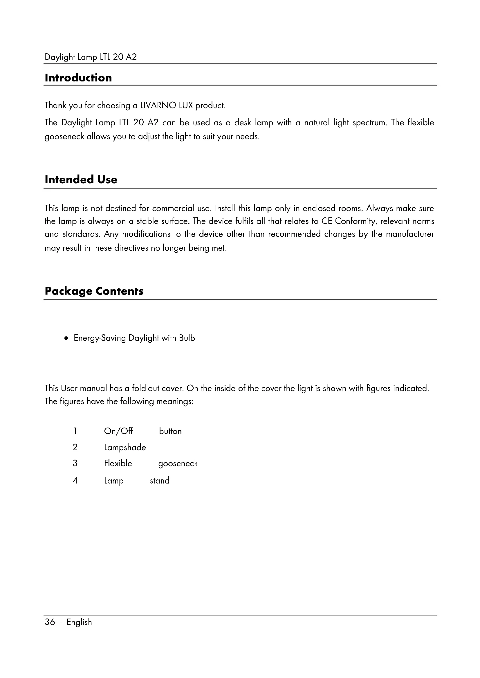This User manual has a fold-out cover. On the inside of the cover the light is shown with figures indicated. The figures have the following meanings: 1 On/Off button 2 Lampshade 3 Flexible gooseneck 4 Lamp standDaylight Lamp LTL 20 A2 English - 37 Technical Specifications Manufacturer: LIVARNO LUX Model name: LTL 20 A2 Operating voltage: 230 V