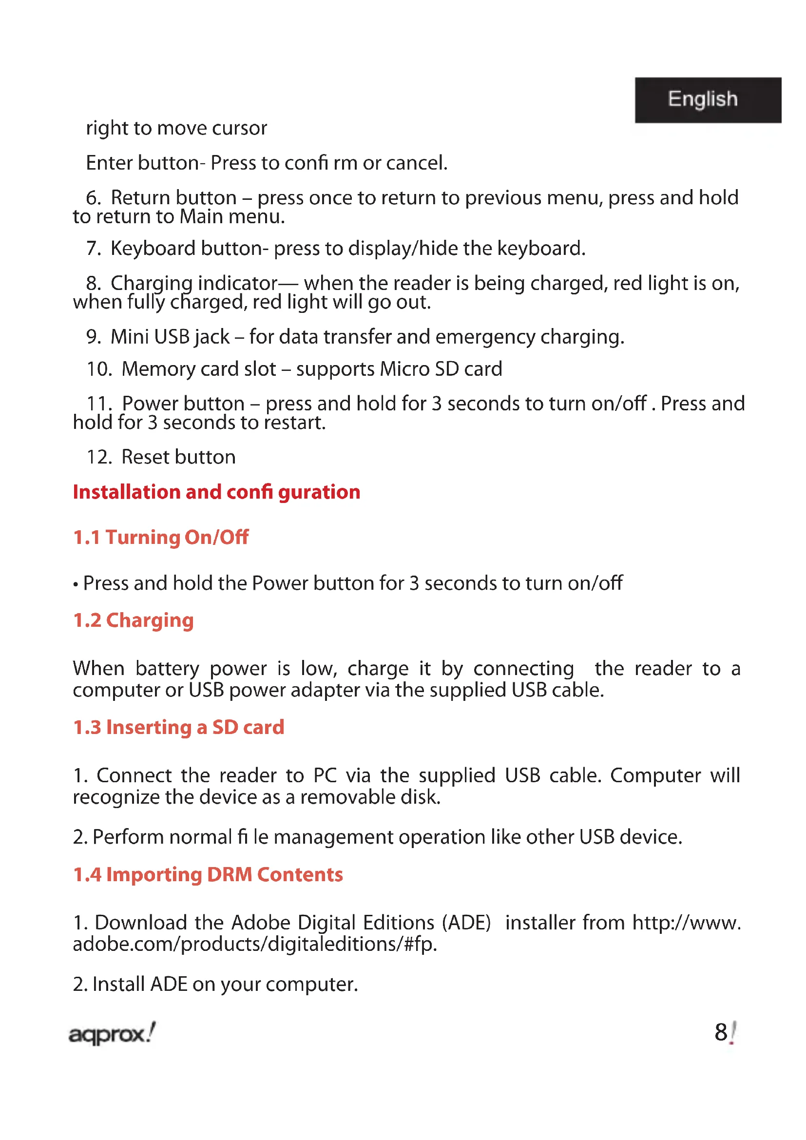 - Charging indicator—when the reader is being charged, red light is on, when fully charged, red light will go out.
