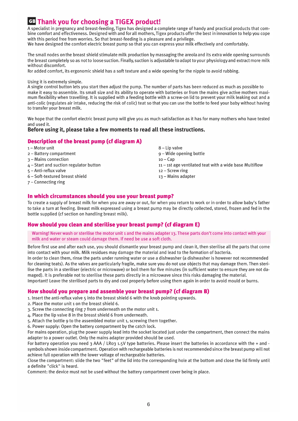For mains operation, plug the power supply lead into the socket located just under the compartment, then connect the mains adapter to a power outlet. Only the mains adapter provided should be used. For battery operation you need 3 AAA / LR03 1.5V type batteries. Please insert the batteries in accordance with the + and - symbols shown inside compartment. Operation with rechargeable batteries is not recommended since the breast pump will not achieve full operation with the lower voltage of rechargeable batteries. Close the compartment: slide the two "feet" of the lid into the corresponding hole at the bottom and close the lid firmly until a definite "click" is heard. Comment: the device must not be used without the battery compartment cover being in place. Thank you for choosing a TIGEX product! A specialist in pregnancy and breast-feeding, Tigex has designed a complete range of handy and practical products that com- bine comfort and effectiveness. Designed with and for all mothers, Tigex products offer the best in innovation to help you cope with this period free from worries. So that breast-feeding is a pleasure and a privilege. We have designed the comfort electric breast pump so that you can express your milk effectively and comfortably.