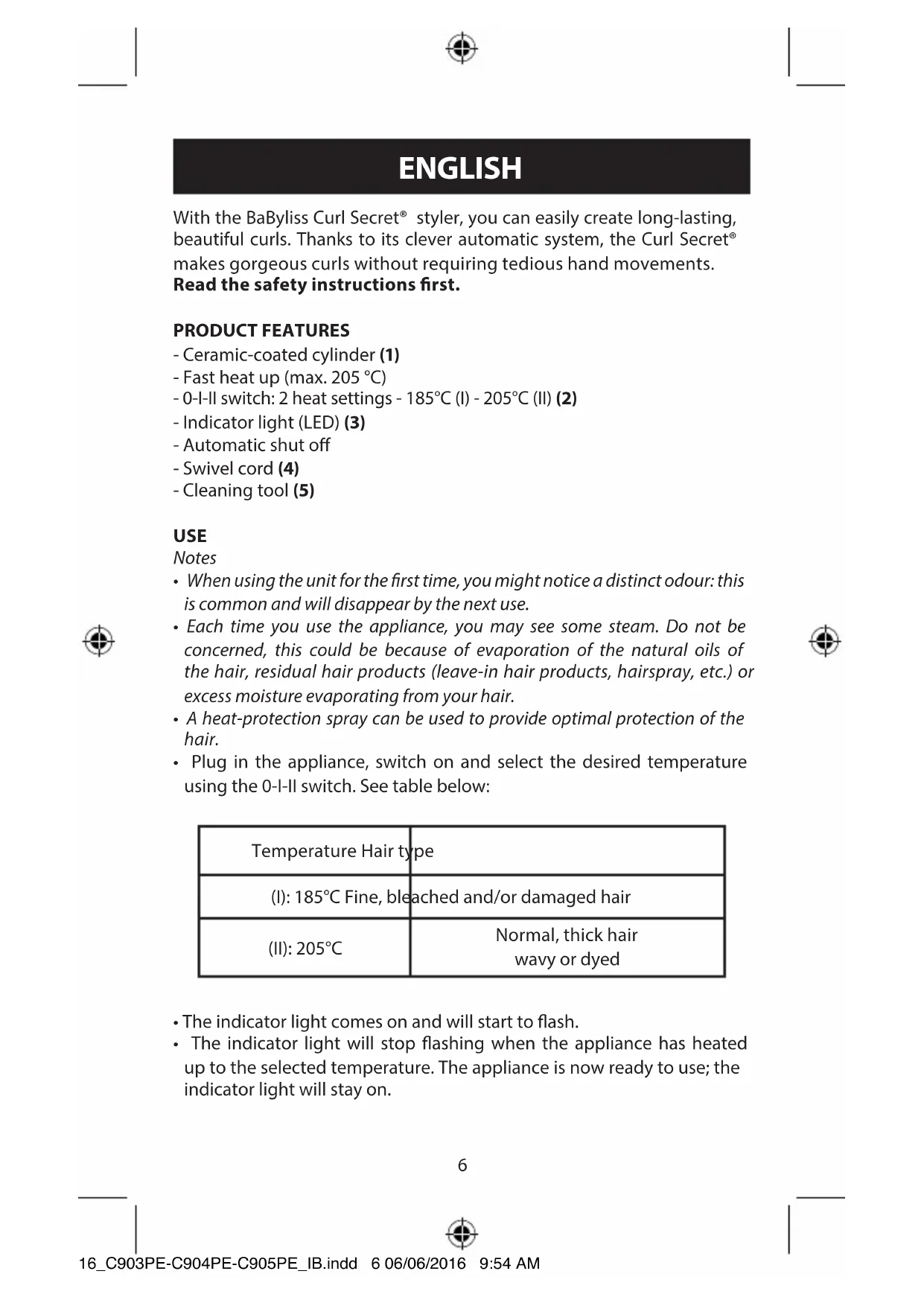 - Plug in the appliance, switch on and select the desired temperature using the 0-I-II switch. See table below: Temperature Hair type (I): 185°C Fine, bleached and/or damaged hair (II): 205°C Normal, thick hair wavy or dyed
