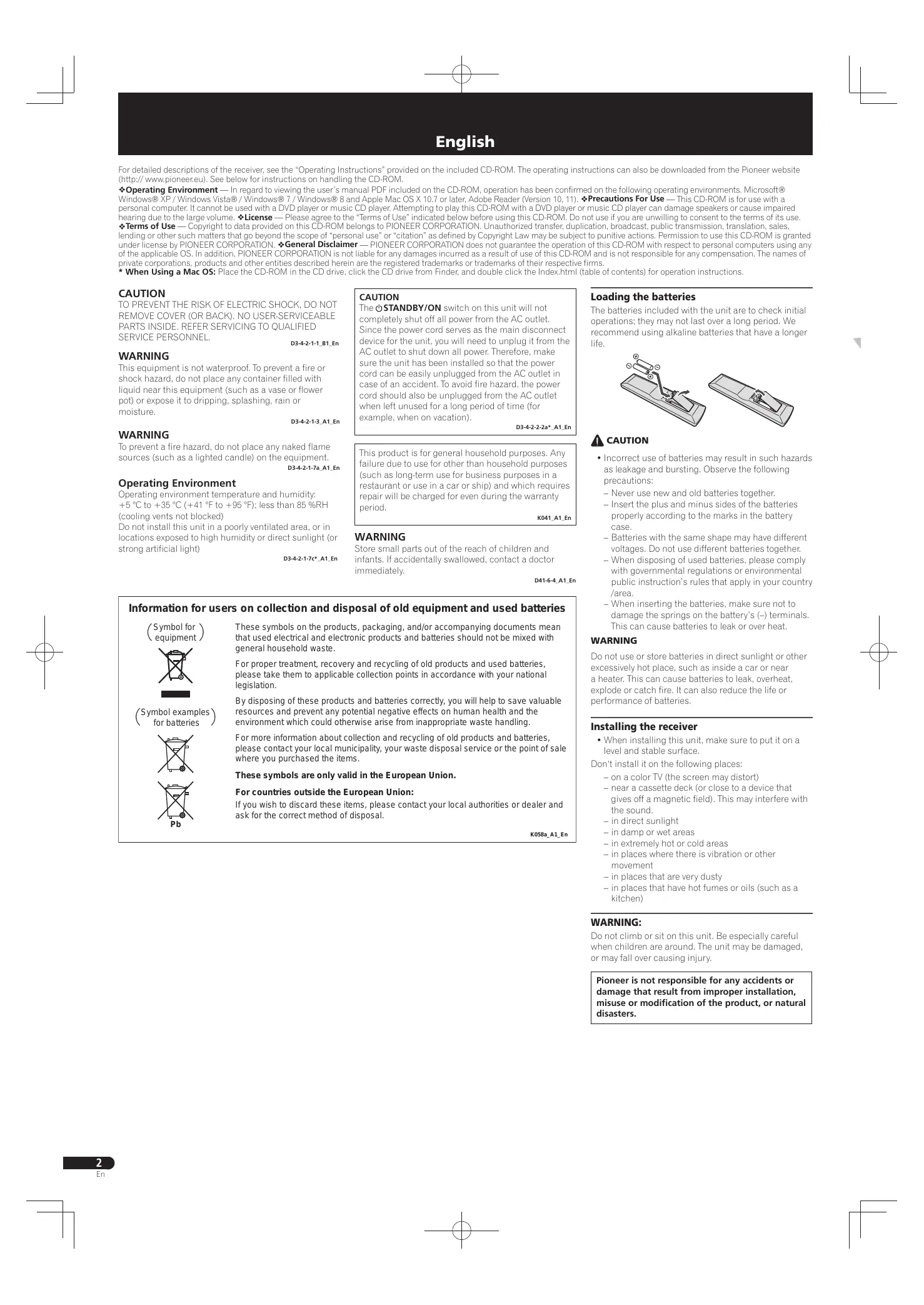 For detailed descriptions of the receiver, see the “Operating Instructions” provided on the included CD-ROM. The operating instructions can also be downloaded from the Pioneer website (http:// www.pioneer.eu). See below for instructions on handling the CD-ROM. Operating Environment — In regard to viewing the user’s manual PDF included on the CD-ROM, operation has been confirmed on the following operating environments. Microsoft® Windows® XP / Windows Vista® / Windows® 7 / Windows® 8 and Apple Mac OS X 10.7 or later, Adobe Reader (Version 10, 11). Precautions For Use — This CD-ROM is for use with a personal computer. It cannot be used with a DVD player or music CD player. Attempting to play this CD-ROM with a DVD player or music CD player can damage speakers or cause impaired hearing due to the large volume. License — Please agree to the “Terms of Use” indicated below before using this CD-ROM. Do not use if you are unwilling to consent to the terms of its use. Terms of Use — Copyright to data provided on this CD-ROM belongs to PIONEER CORPORATION. Unauthorized transfer, duplication, broadcast, public transmission, translation, sales, lending or other such matters that go beyond the scope of “personal use” or “citation” as defined by Copyright Law may be subject to punitive actions. Permission to use this CD-ROM is granted under license by PIONEER CORPORATION. General Disclaimer — PIONEER CORPORATION does not guarantee the operation of this CD-ROM with respect to personal computers using any of the applicable OS. In addition, PIONEER CORPORATION is not liable for any damages incurred as a result of use of this CD-ROM and is not responsible for any compensation. The names of private corporations, products and other entities described herein are the registered trademarks or trademarks of their respective firms. * When Using a Mac OS: Place the CD-ROM in the CD drive, click the CD drive from Finder, and double click the Index.html (table of contents) for operation instructions.