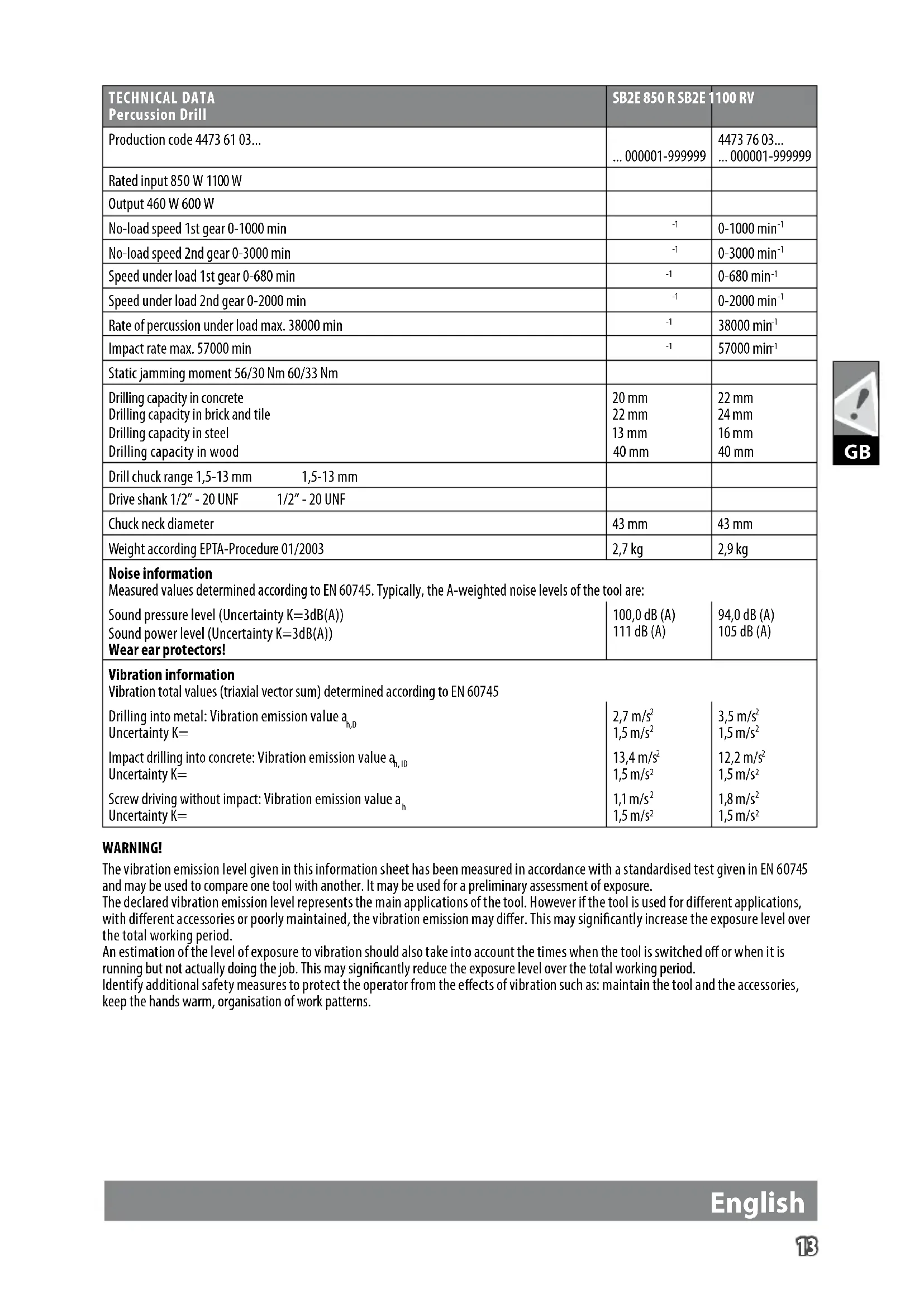 Static jamming moment 56/30 Nm 60/33 Nm Drilling capacity in concrete 20 mm 22 mm Drilling capacity in brick and tile 22 mm 24 mm Drilling capacity in steel 13 mm 16 mm Drilling capacity in wood 40 mm 40 mm Drill chuck range 1,5-13 mm 1,5-13 mm Drive shank 1/2” - 20 UNF 1/2” - 20 UNF Chuck neck diameter 43 mm 43 mm Weight according EPTA-Procedure 01/2003 2,7 kg 2,9 kg Noise information Measured values determined according to EN 60745. Typically, the A-weighted noise levels of the tool are: Sound pressure level (Uncertainty K=3dB(A)) Sound power level (Uncertainty K=3dB(A)) Wear ear protectors! 100,0 dB (A) 111 dB (A) 94,0 dB (A) 105 dB (A) Vibration information Vibration total values (triaxial vector sum) determined according to EN 60745 Drilling into metal: Vibration emission value a h,D Uncertainty K= 2,7 m/s
