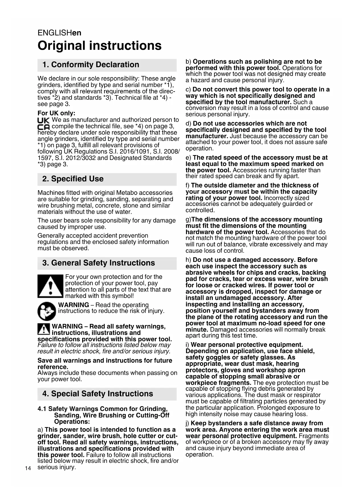 Original instructions We declare in our sole responsibility: These angle grinders, identified by type and serial number *1), comply with all relevant requirements of the direc- tives *2) and standards *3). Technical file at *4) - see page 3. For UK only: We as manufacturer and authorized person to compile the technical file, see *4) on page 3, hereby declare under sole responsibility that these angle grinders, identified by type and serial number *1) on page 3, fulfill all relevant provisions of following UK Regulations S.I. 2016/1091, S.I. 2008/ 1597, S.I. 2012/3032 and Designated Standards *3) page 3. Machines fitted with original Metabo accessories are suitable for grinding, sanding, separating and wire brushing metal, concrete, stone and similar materials without the use of water. The user bears sole responsibility for any damage caused by improper use. Generally accepted accident prevention regulations and the enclosed safety information must be observed. For your own protection and for the protection of your power tool, pay attention to all parts of the text that are marked with this symbol! WARNING – Read the operating instructions to reduce the risk of injury. WARNING – Read all safety warnings, instructions, illustrations and specifications provided with this power tool. Failure to follow all instructions listed below may result in electric shock, fire and/or serious injury. Save all warnings and instructions for future reference. Always include these documents when passing on your power tool.