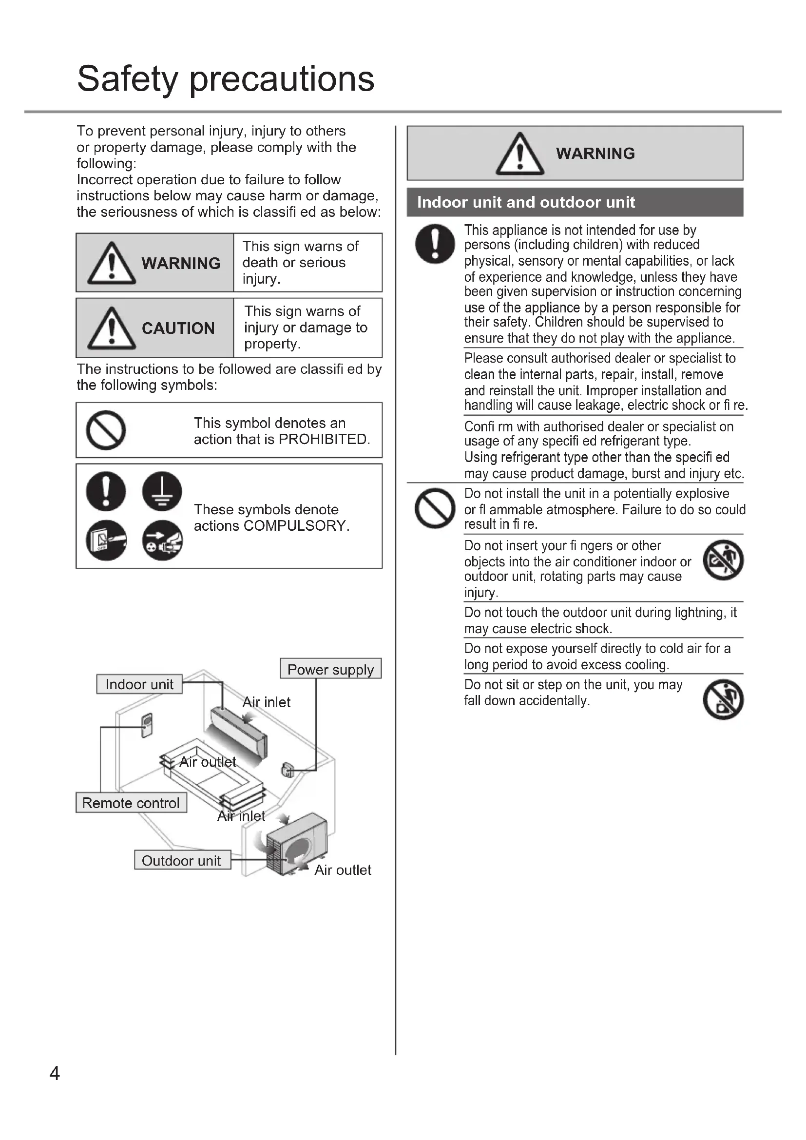 - Selection range: 16 °C ~ 30 °C. Table of contents Safety precautions ...................4-5 How to use...............................6-7 To set the timer ........................7-8 Cleaning instructions ..................9 Troubleshooting ...................10-11 Information................................ 114 Safety precautions To prevent personal injury, injury to others or property damage, please comply with the following: Incorrect operation due to failure to follow instructions below may cause harm or damage, the seriousness of which is classifi ed as below: WARNING This sign warns of death or serious injury. CAUTION This sign warns of injury or damage to property. The instructions to be followed are classifi ed by the following symbols: This symbol denotes an action that is PROHIBITED. These symbols denote actions COMPULSORY. WARNING Indoor unit and outdoor unit This appliance is not intended for use by persons (including children) with reduced physical, sensory or mental capabilities, or lack of experience and knowledge, unless they have been given supervision or instruction concerning use of the appliance by a person responsible for their safety. Children should be supervised to ensure that they do not play with the appliance. Please consult authorised dealer or specialist to clean the internal parts, repair, install, remove and reinstall the unit. Improper installation and handling will cause leakage, electric shock or fi re. Confi rm with authorised dealer or specialist on usage of any specifi ed refrigerant type. Using refrigerant type other than the specifi ed may cause product damage, burst and injury etc. Do not install the unit in a potentially explosive or fl ammable atmosphere. Failure to do so could result in fi re. Do not insert your fi ngers or other objects into the air conditioner indoor or outdoor unit, rotating parts may cause injury. Do not touch the outdoor unit during lightning, it may cause electric shock. Do not expose yourself directly to cold air for a long period to avoid excess cooling. Do not sit or step on the unit, you may fall down accidentally. Indoor unit Outdoor unit Power supply Remote control Air inlet Air inlet Air inlet Air inlet Air outlet Air outlet Air outlet Air outlet5 English Power supply Do not use a modifi ed cord, joint cord, extension cord or unspecifi ed cord to prevent overheating and fi re. To prevent overheating, fi re or electric shock: