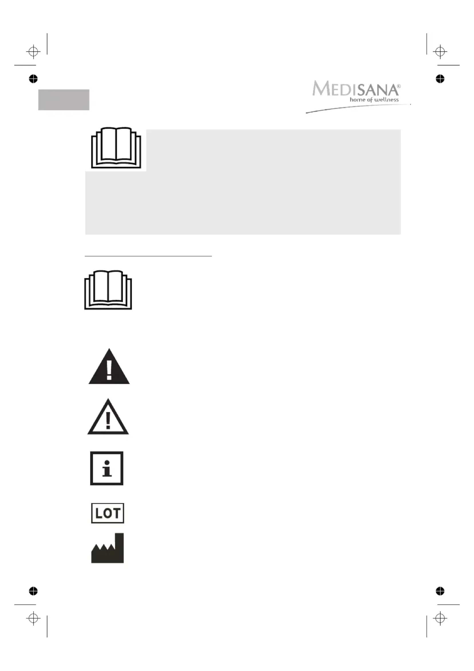 1 Safety InformationŸBefore connecting the device to your power supply, please ensure that the supply voltage stated on the rating plate is compatible with your mains supply. ŸOnly insert the power supply unit into a socket when the appliance is switched off. ŸOnly use the power supply unit supplied for the massager. ŸKeep the power supply unit, cable and appliance well away from heat, hot surfaces, moisture and liquids. ŸDo not touch the power supply unit when you are standing in water and always take hold of the plug with dry hands. ŸDo not take hold of a device if it falls into water. Pull out the power plug and the power supply unit from the socket immediately. ŸConnect the device only in that way, so that the power plug is freely accessible. ŸAlways switch off the appliance after use with the buttons on the control unit and unplug the power supply unit. ŸTo disconnect the unit from the power supply, always pull the plug out of the socket. Do not pull on the cable! Ÿ Do not carry, pull or rotate the device by its power cord. ŸIf the power supply cable is damaged, it may only be replaced by MEDISANA, an authorised dealer or by qualified personnel. ŸEnsure that the cable will not cause tripping. The cable must not be kinked, trapped or twisted. about the power supply