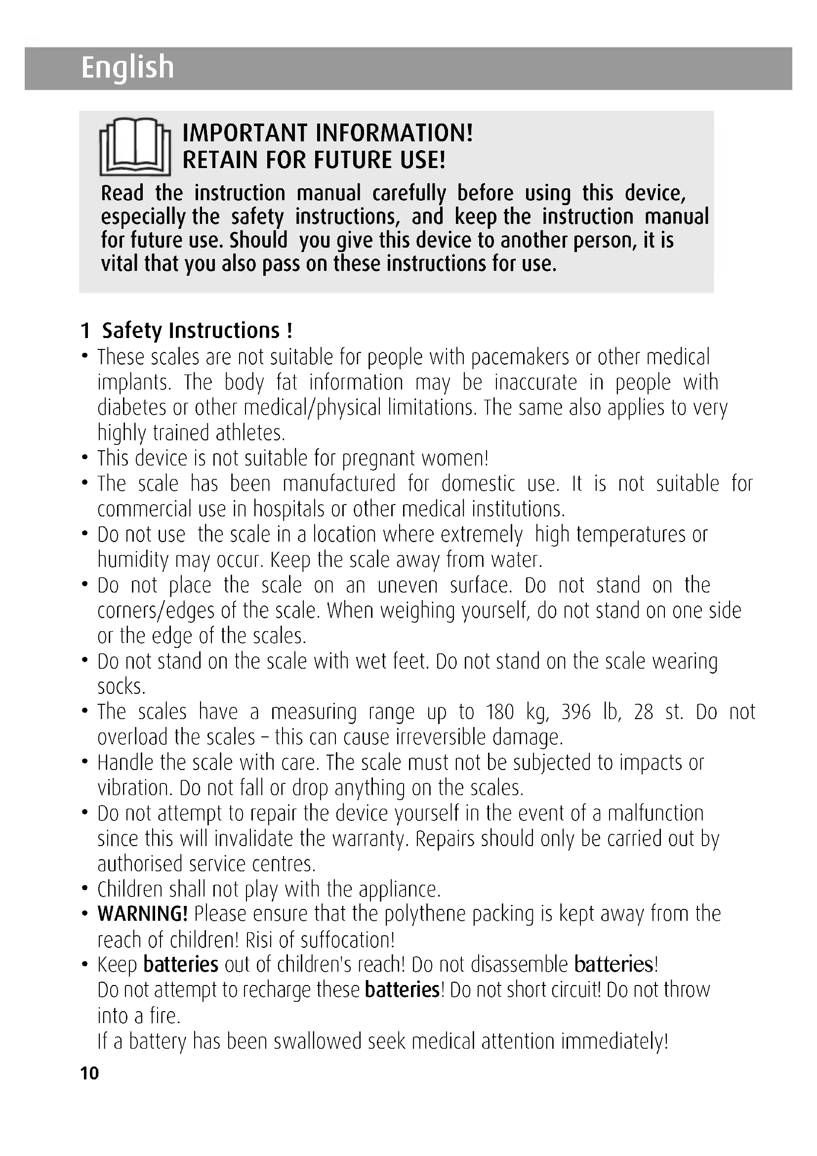 • This device is not suitable for pregnant women! - The scale has been manufactured for domestic use. It is not suitable for commercial use in hospitals or other medical institutions.