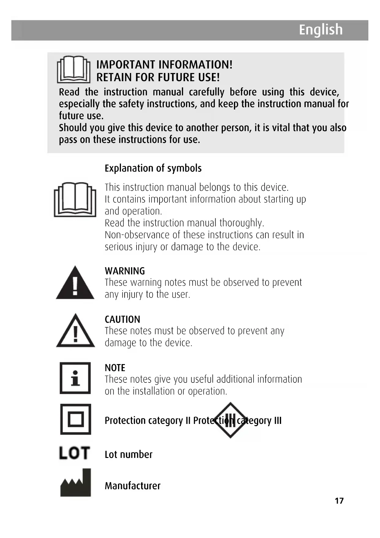 These warning notes must be observed to prevent any injury to the user.