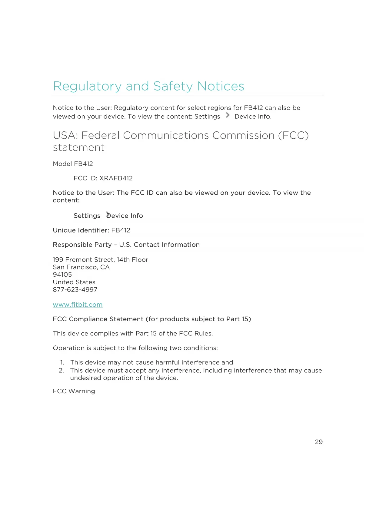 United States 877-623-4997 www.fitbit.com FCC Compliance Statement (for products subject to Part 15) This device complies with Part 15 of the FCC Rules. Operation is subject to the following two conditions: