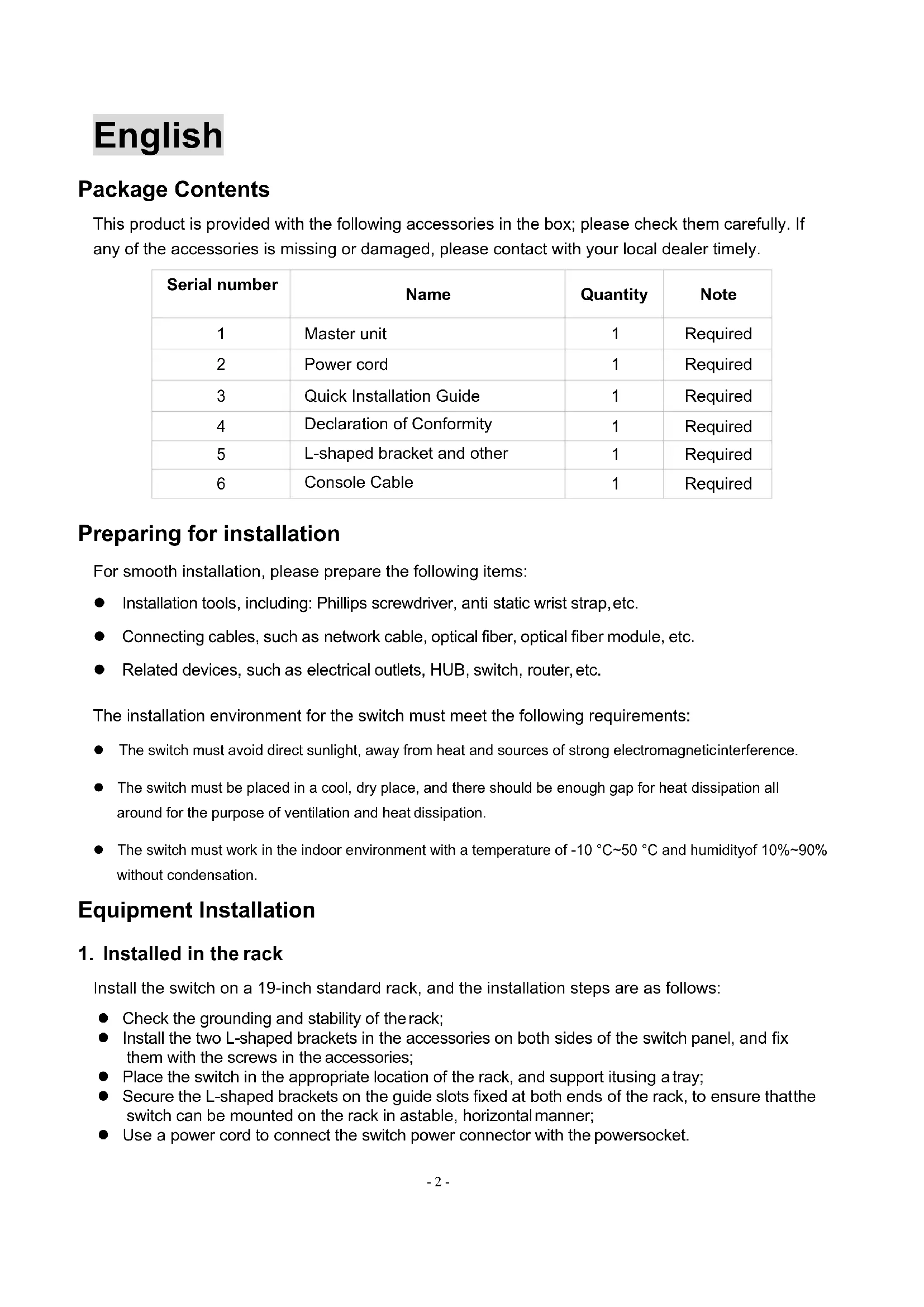 Required Preparing for installation For smooth installation, please prepare the following items: l Installation tools, including: Phillips screwdriver, anti static wrist strap, etc. l Connecting cables, such as network cable, optical fiber, optical fiber module, etc. l Related devices, such as electrical outlets, HUB, switch, router, etc. The installation environment for the switch must meet the following requirements: l The switch must avoid direct sunlight, away from heat and sources of strong electromagnetic interference. l The switch must be placed in a cool, dry place, and there should be enough gap for heat dissipation all around for the purpose of ventilation and heat dissipation. l The switch must work in the indoor environment with a temperature of -10 °C~50 °C and humidityof 10%~90% without condensation. Equipment Installation