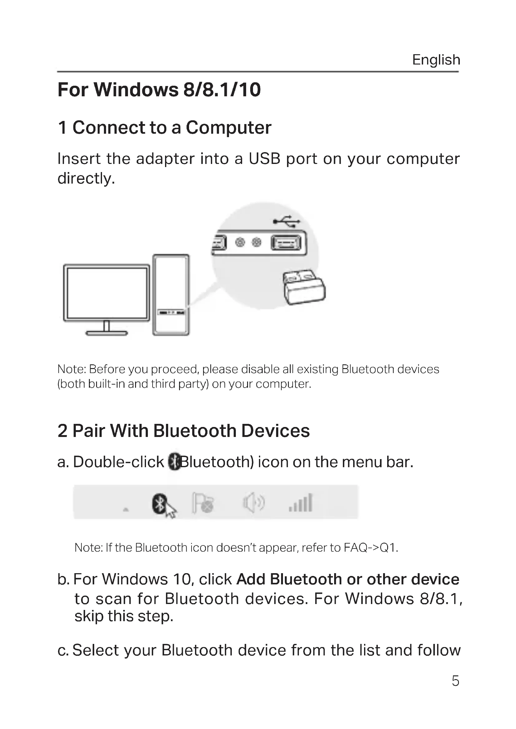 For Windows 8/8.1/10 1 Connect to a Computer Insert the adapter into a USB port on your computer directly. Note: Before you proceed, please disable all existing Bluetooth devices (both built-in and third party) on your computer. 2 Pair With Bluetooth Devices a. Double-click (Bluetooth) icon on the menu bar. Note: If the Bluetooth icon doesn’t appear, refer to FAQ->Q1. b. For Windows 10, click Add Bluetooth or other device to scan for Bluetooth devices. For Windows 8/8.1, skip this step. c. Select your Bluetooth device from the list and followEnglish