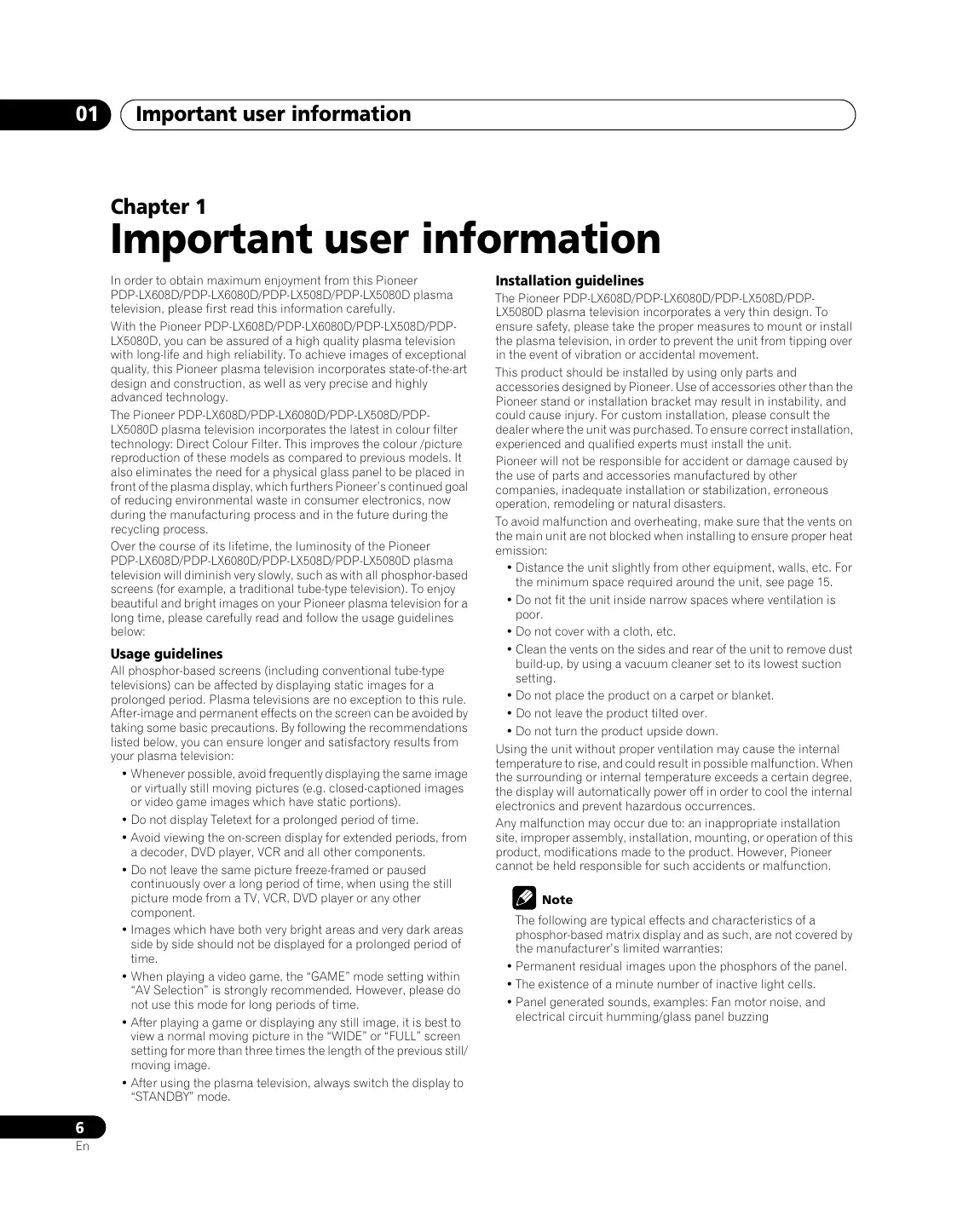 Important user information In order to obtain maximum enjoyment from this Pioneer PDP-LX608D/PDP-LX6080D/PDP-LX508D/PDP-LX5080D plasma television, please first read this information carefully. With the Pioneer PDP-LX608D/PDP-LX6080D/PDP-LX508D/PDPLX5080D, you can be assured of a high quality plasma television with long-life and high reliability. To achieve images of exceptional quality, this Pioneer plasma television incorporates state-of-the-art design and construction, as well as very precise and highly advanced technology. The Pioneer PDP-LX608D/PDP-LX6080D/PDP-LX508D/PDPLX5080D plasma television incorporates the latest in colour filter technology: Direct Colour Filter. This improves the colour /picture reproduction of these models as compared to previous models. It also eliminates the need for a physical glass panel to be placed in front of the plasma display, which furthers Pioneer’s continued goal of reducing environmental waste in consumer electronics, now during the manufacturing process and in the future during the recycling process. Over the course of its lifetime, the luminosity of the Pioneer PDP-LX608D/PDP-LX6080D/PDP-LX508D/PDP-LX5080D plasma television will diminish very slowly, such as with all phosphor-based screens (for example, a traditional tube-type television). To enjoy beautiful and bright images on your Pioneer plasma television for a long time, please carefully read and follow the usage guidelines below: