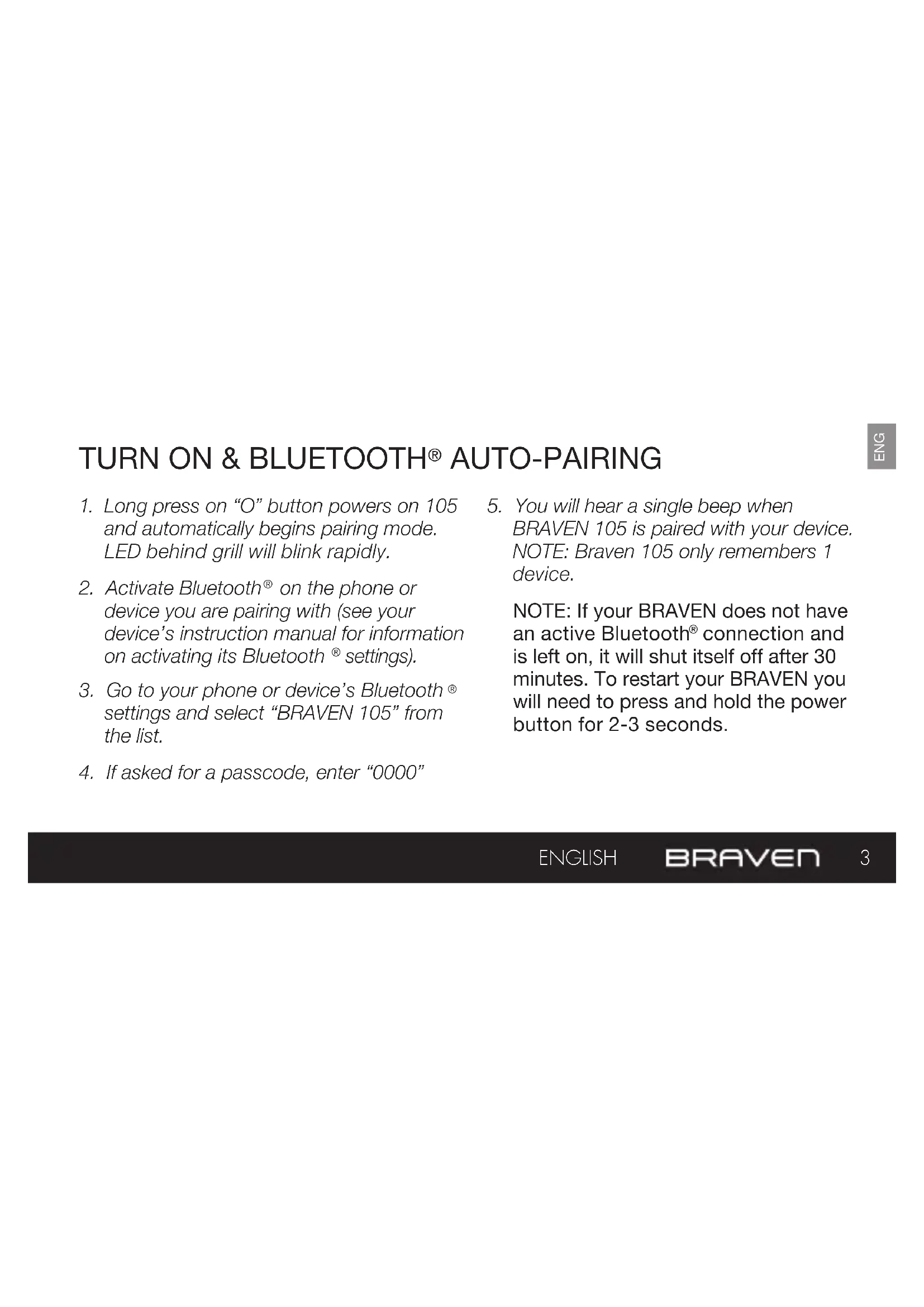 connection and is left on, it will shut itself off after 30 minutes. To restart your BRAVEN you will need to press and hold the power button for 2-3 seconds.4 Full manual and troubleshooting: braven.com/manuals ENGLISH