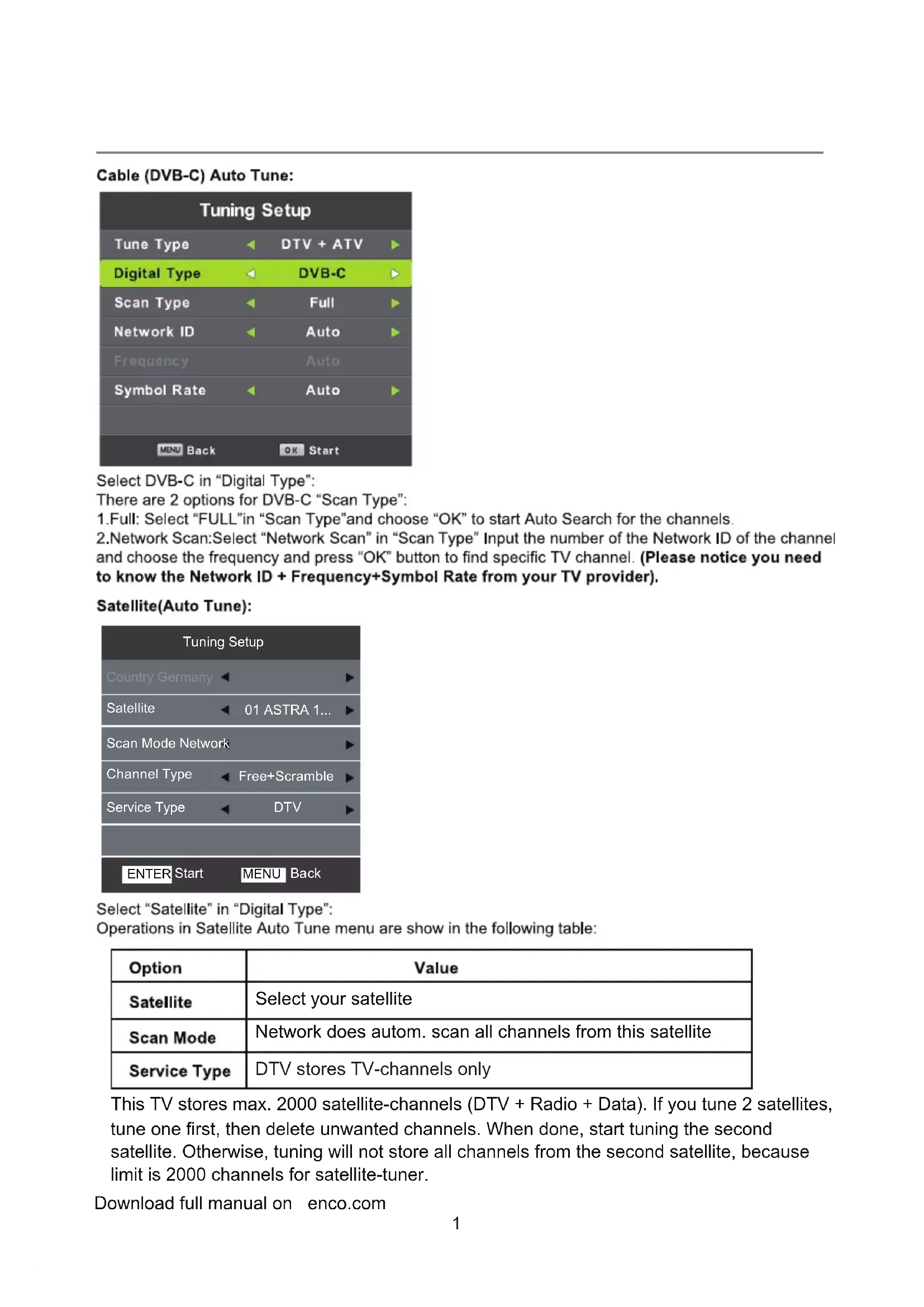 Tuning Setup Country Germany Satellite 01 ASTRA 1... Back MENU Scan Mode Network Channel Type Free+Scramble Service Type DTV Start ENTER Select your satellite Network does autom. scan all channels from this satellite DTV stores TV-channels only This TV stores max. 2000 satellite-channels (DTV + Radio + Data). If you tune 2 satellites, tune one first, then delete unwanted channels. When done, start tuning the second satellite. Otherwise, tuning will not store all channels from the second satellite, because limit is 2000 channels for satellite-tuner. Download full manual on L enco.com/ ÿÿ16 Main Menu Operation Channel Menu Press MENU button to display the main menu. Press ◄/► button to select CHANNEL in the main menu.