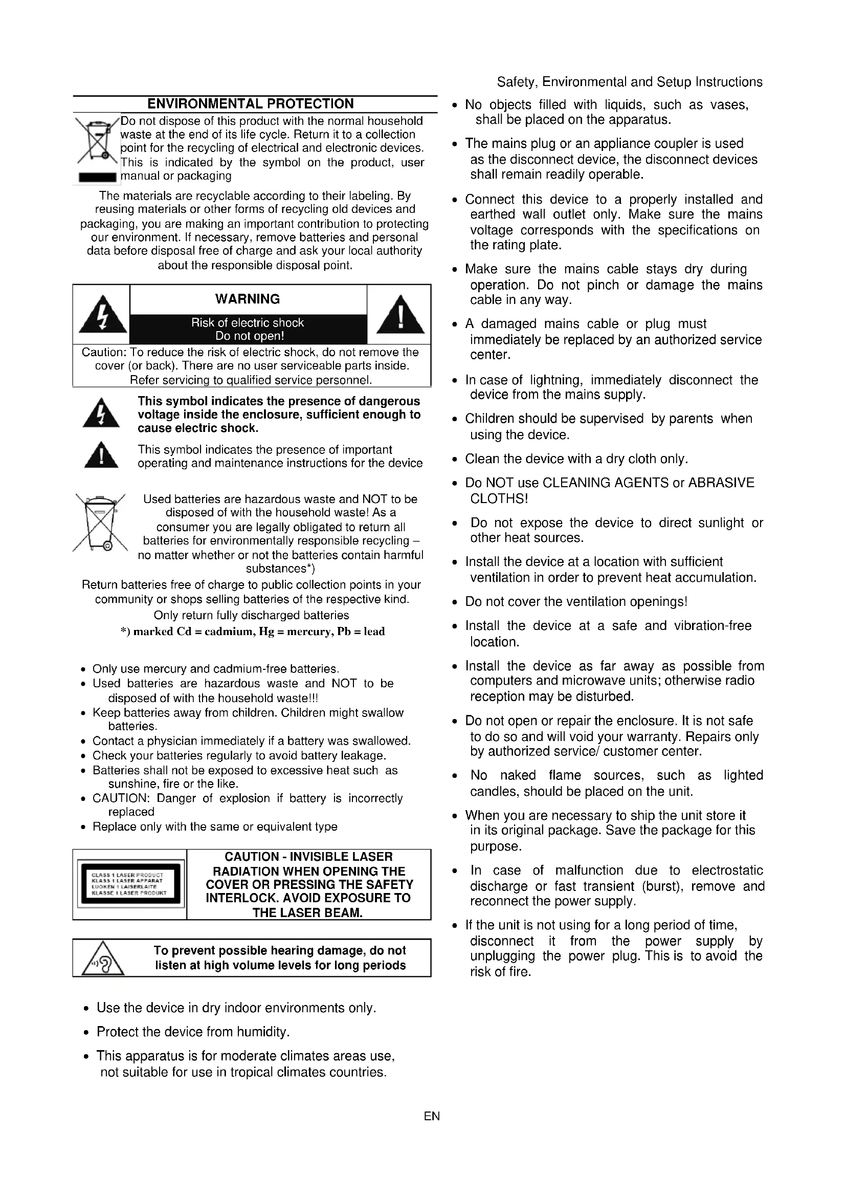 | Caution: To reduce the risk of electric shock, do not remove the cover (or back). There are no user serviceable parts inside. Refer servicing to qualified service personnel. | ||