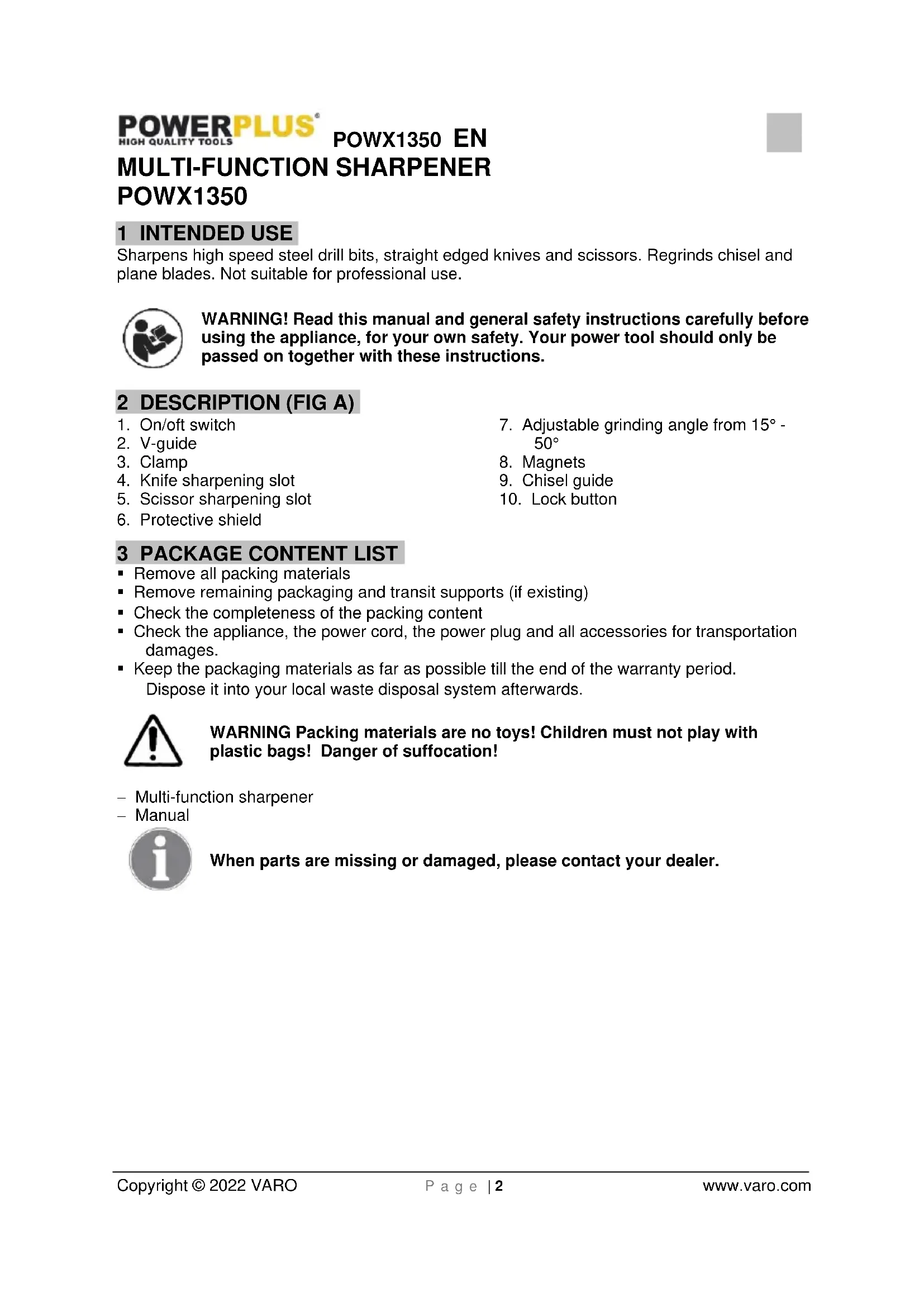 - Keep the packaging materials as far as possible till the end of the warranty period. Dispose it into your local waste disposal system afterwards. WARNING Packing materials are no toys! Children must not play with plastic bags! Danger of suffocation! − Multi-function sharpener − Manual When parts are missing or damaged, please contact your dealer.POWX1350 EN Copyright © 2022 VARO P a g e | 3 www.varo.com 4 SYMBOLS In this manual and/or on the machine the following symbols are used: