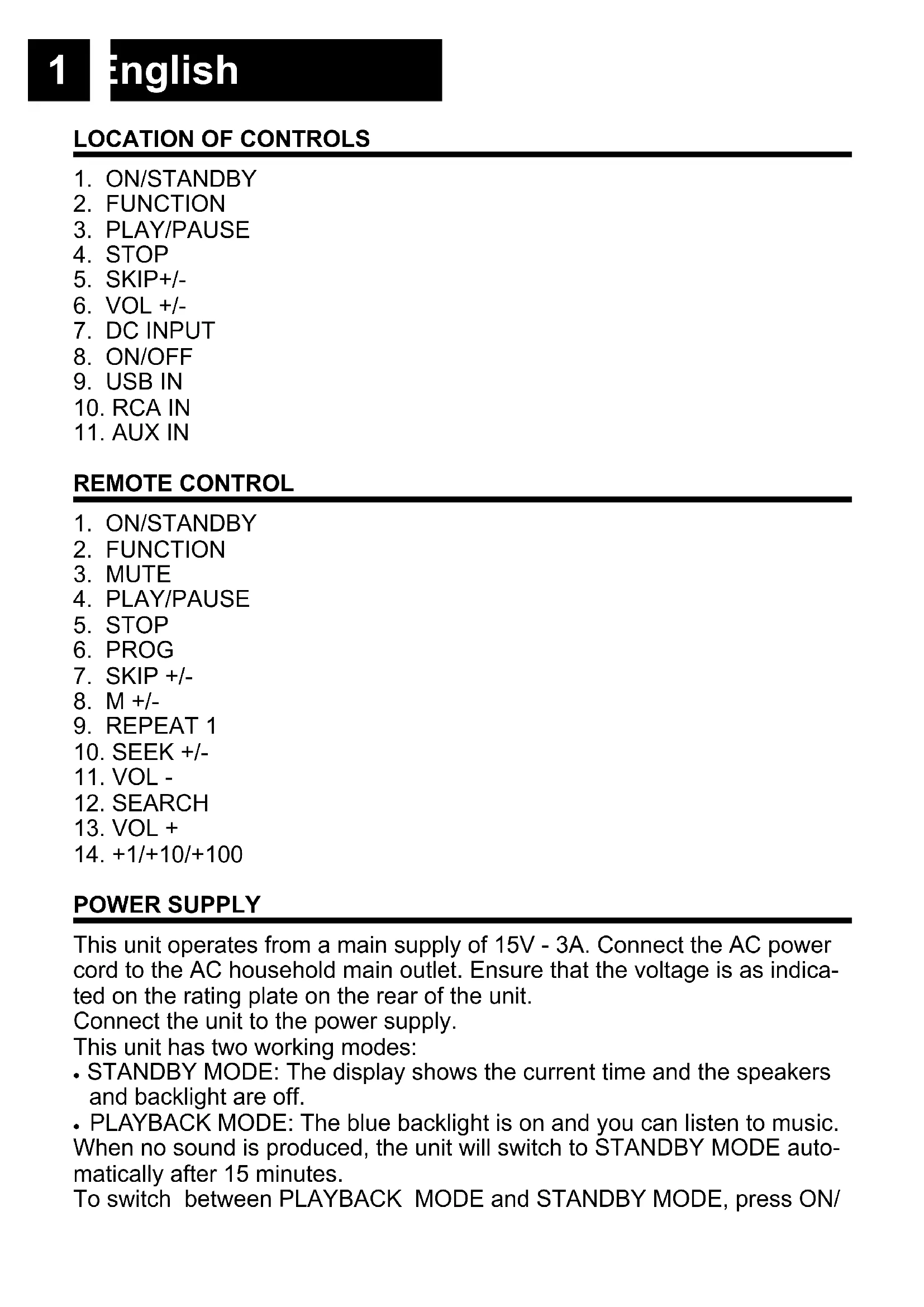 POWER SUPPLY This unit operates from a main supply of 15V - 3A. Connect the AC power cord to the AC household main outlet. Ensure that the voltage is as indica- ted on the rating plate on the rear of the unit. Connect the unit to the power supply. This unit has two working modes: STANDBY MODE: The display shows the current time and the speakers and backlight are off. PLAYBACK MODE: The blue backlight is on and you can listen to music. When no sound is produced, the unit will switch to STANDBY MODE auto- matically after 15 minutes. To switch between PLAYBACK MODE and STANDBY MODE, press ON/2 English STANDBY (1) (1 on remote control).