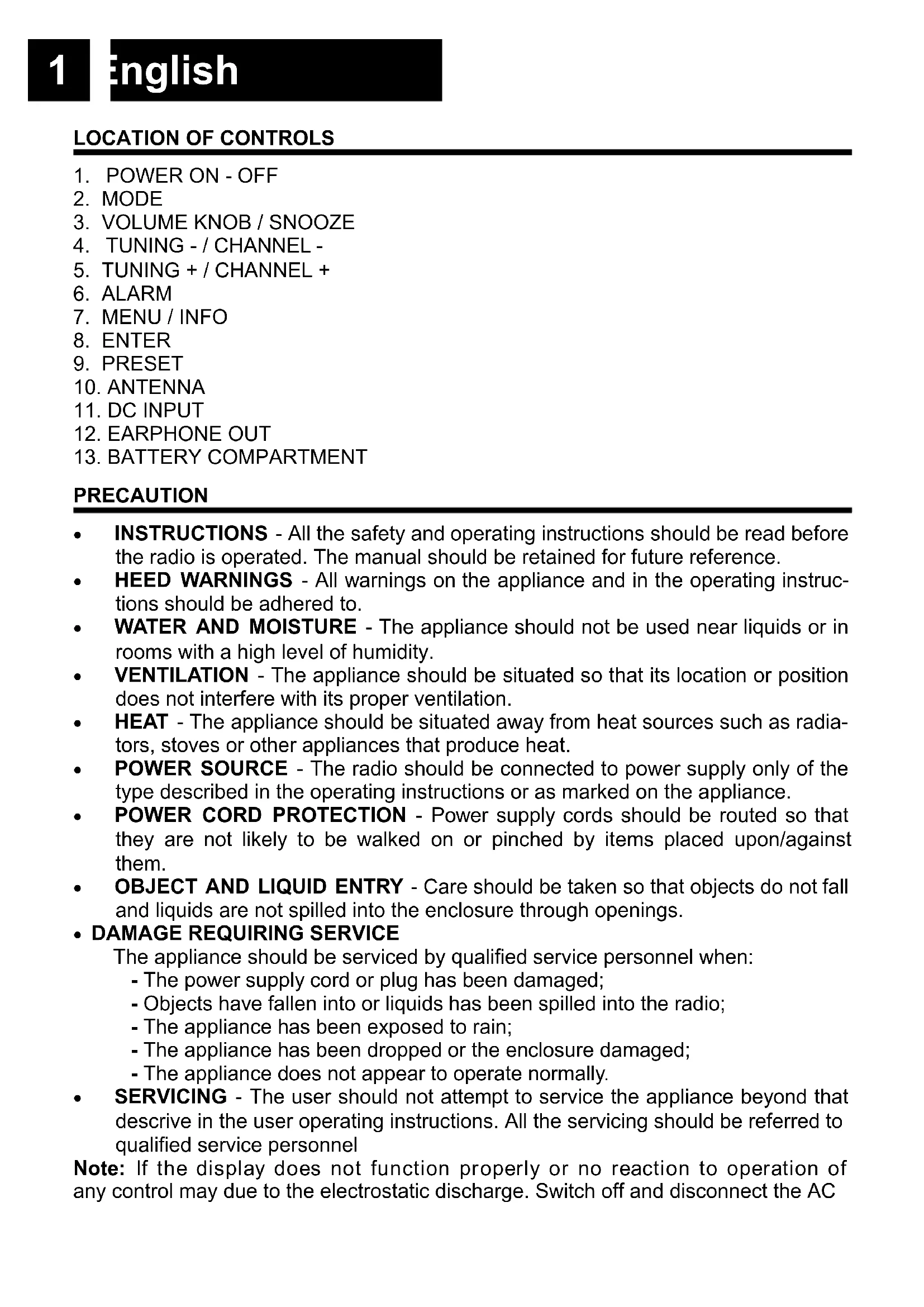 PRECAUTION INSTRUCTIONS - All the safety and operating instructions should be read before the radio is operated. The manual should be retained for future reference. HEED WARNINGS - All warnings on the appliance and in the operating instruc- tions should be adhered to. WATER AND MOISTURE - The appliance should not be used near liquids or in rooms with a high level of humidity. VENTILATION - The appliance should be situated so that its location or position does not interfere with its proper ventilation. HEAT - The appliance should be situated away from heat sources such as radia- tors, stoves or other appliances that produce heat. POWER SOURCE - The radio should be connected to power supply only of the type described in the operating instructions or as marked on the appliance. POWER CORD PROTECTION - Power supply cords should be routed so that they are not likely to be walked on or pinched by items placed upon/against them. OBJECT AND LIQUID ENTRY - Care should be taken so that objects do not fall and liquids are not spilled into the enclosure through openings.