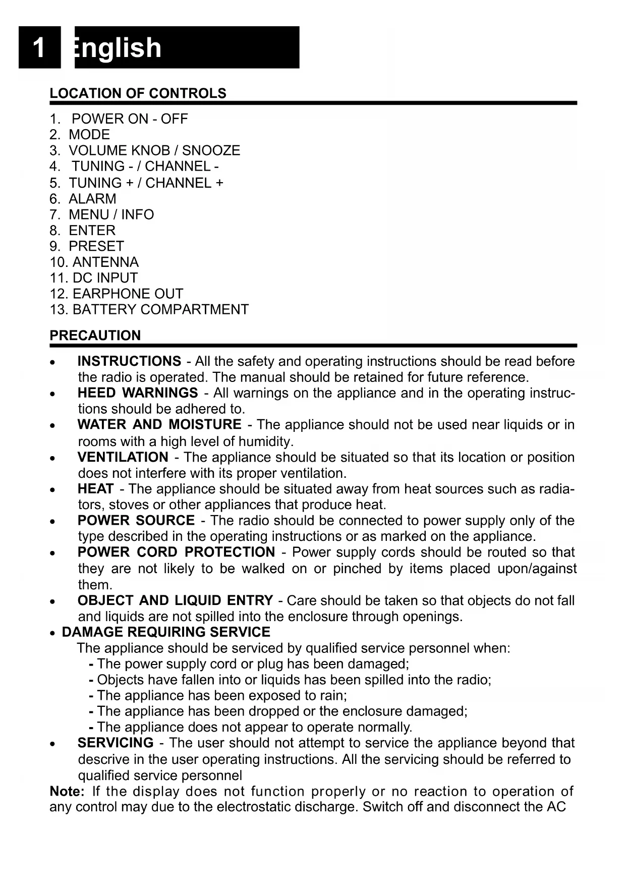 The appliance should be serviced by qualified service personnel when: - The power supply cord or plug has been damaged; - Objects have fallen into or liquids has been spilled into the radio; - The appliance has been exposed to rain; - The appliance has been dropped or the enclosure damaged; - The appliance does not appear to operate normally. SERVICING - The user should not attempt to service the appliance beyond that descrive in the user operating instructions. All the servicing should be referred to qualified service personnel Note: If the display does not function properly or no reaction to operation of any control may due to the electrostatic discharge. Switch off and disconnect the AC2 English cord and remove all the batteries, then turn the power back on after a few seconds. POWER SOURCES AC POWER: You can power your portable stereo system by plugging the AC/DC adaptor into the DC plug (11) at the back of the unit and into a wall AC power outlet. Check that the rated voltage of your appliance matches your local voltage. BATTERY POWER: To use the radio with batteries, disconnect the AC/DC adaptor and insert 4 × “LR6” batteries into the compartment (13). Be sure that the batteries are inserted correctly to avoid damage to the appliance. Remove the batteries when the radio will not be used for a long period of time, as this will cause leakage to the batteries and subsequently damage to your radio.