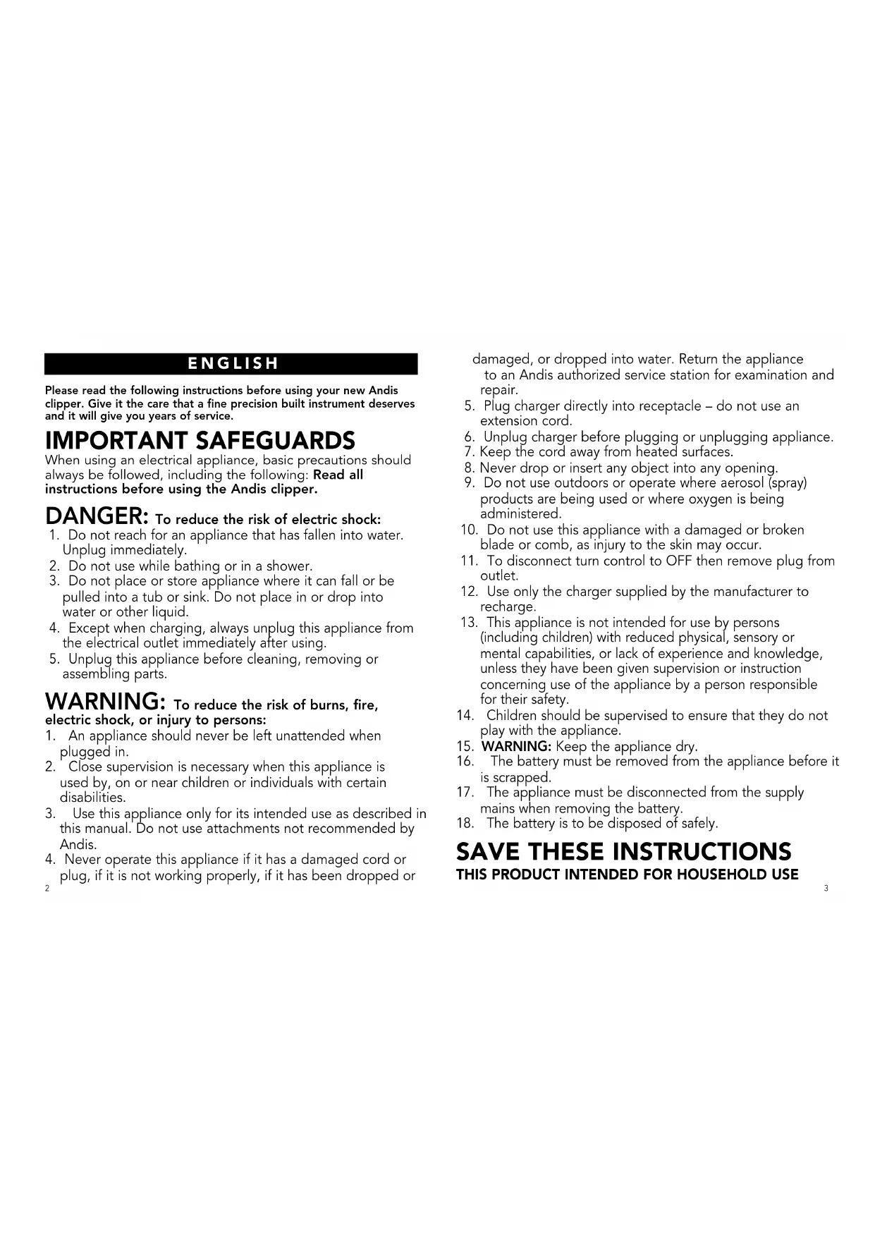 When using an electrical appliance, basic precautions should always be followed, including the following: Read all instructions before using the Andis clipper.