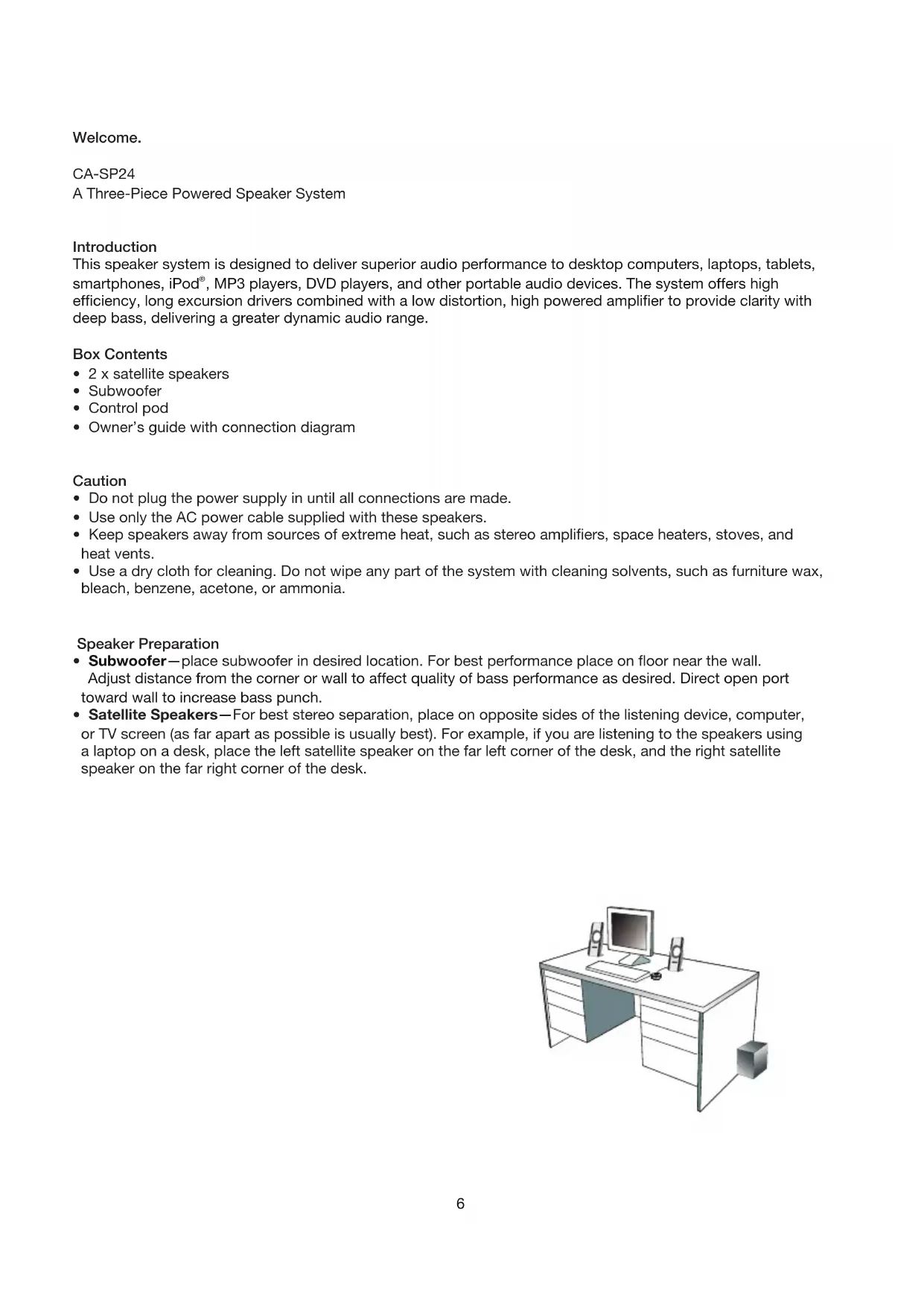 This speaker system is designed to deliver superior audio performance to desktop computers, laptops, tablets, smartphones, iPod ^® , MP3 players, DVD players, and other portable audio devices. The system offers high efficiency, long excursion drivers combined with a low distortion, high powered amplifier to provide clarity with deep bass, delivering a greater dynamic audio range.