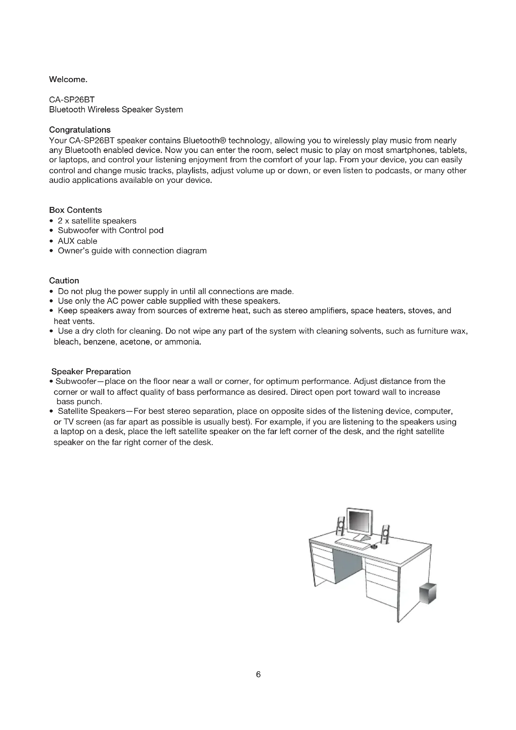 Your CA-SP26BT speaker contains Bluetooth® technology, allowing you to wirelessly play music from nearly any Bluetooth enabled device. Now you can enter the room, select music to play on most smartphones, tablets, or laptops, and control your listening enjoyment from the comfort of your lap. From your device, you can easily control and change music tracks, playlists, adjust volume up or down, or even listen to podcasts, or many other audio applications available on your device.