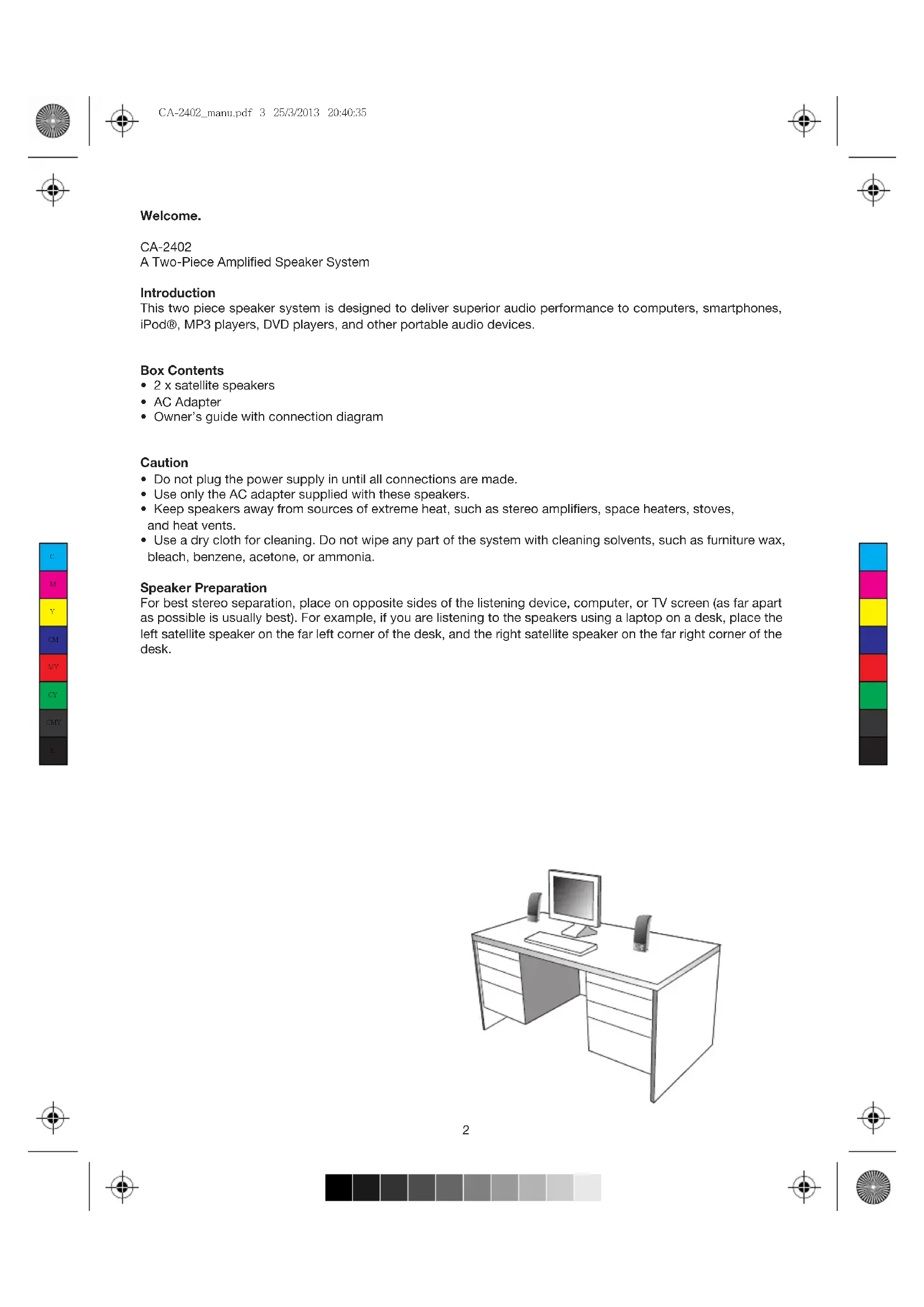 Download the instructions for your Speaker in PDF format for free! Find your manual CA2402 - Cyber Acoustics and take your electronic device back in hand. On this page are published all the documents necessary for the use of your device. CA2402 by Cyber Acoustics.