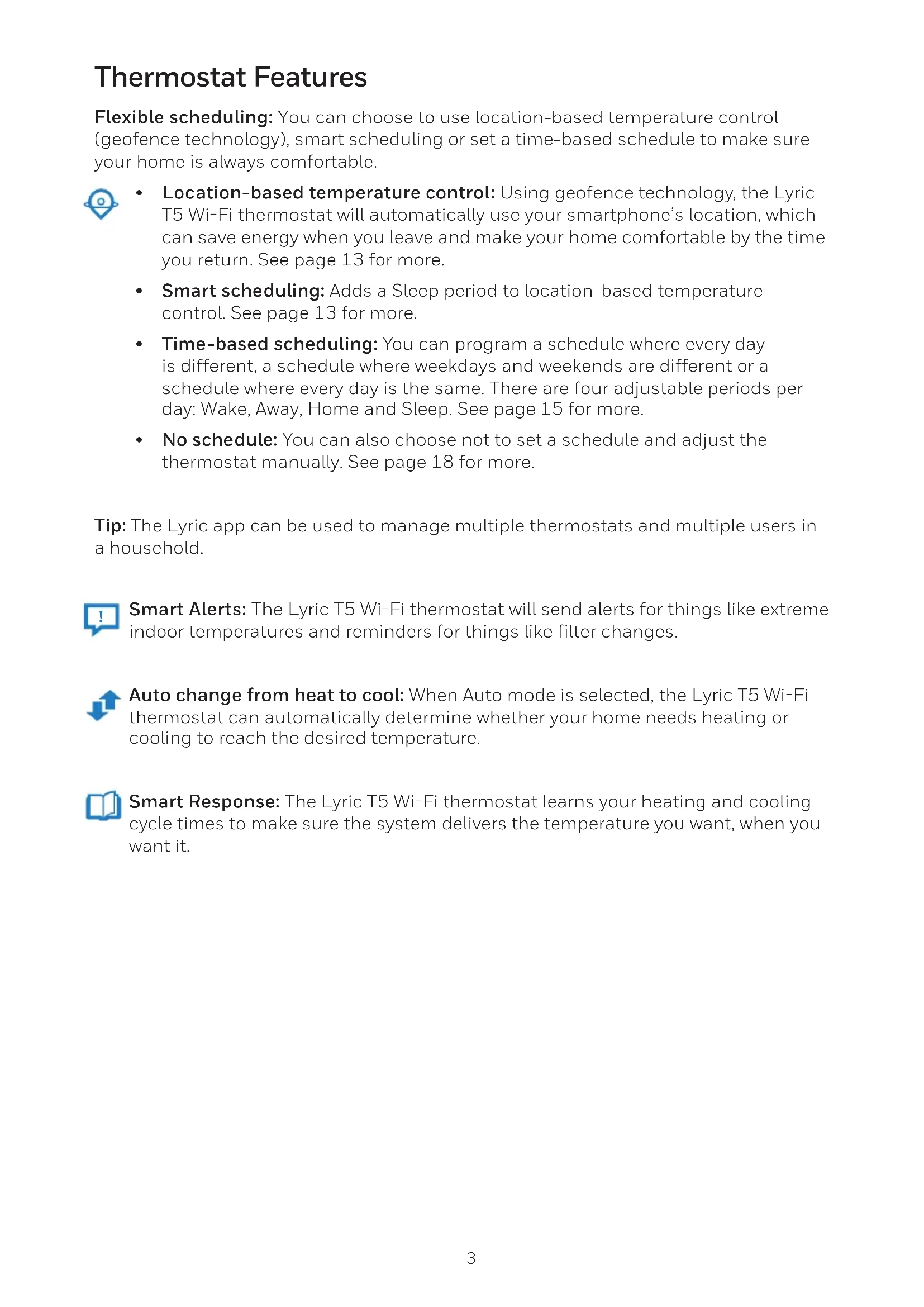 - No schedule: You can also choose not to set a schedule and adjust the thermostat manually. See page 18 for more. Tip: The Lyric app can be used to manage multiple thermostats and multiple users in a household. Smart Alerts: The Lyric T5 WiFi thermostat will send alerts for things like extreme indoor temperatures and reminders for things like filter changes. Auto change from heat to cool: When Auto mode is selected, the Lyric T5 WiFi thermostat can automatically determine whether your home needs heating or cooling to reach the desired temperature. Smart Response: The Lyric T5 WiFi thermostat learns your heating and cooling cycle times to make sure the system delivers the temperature you want, when you want it.