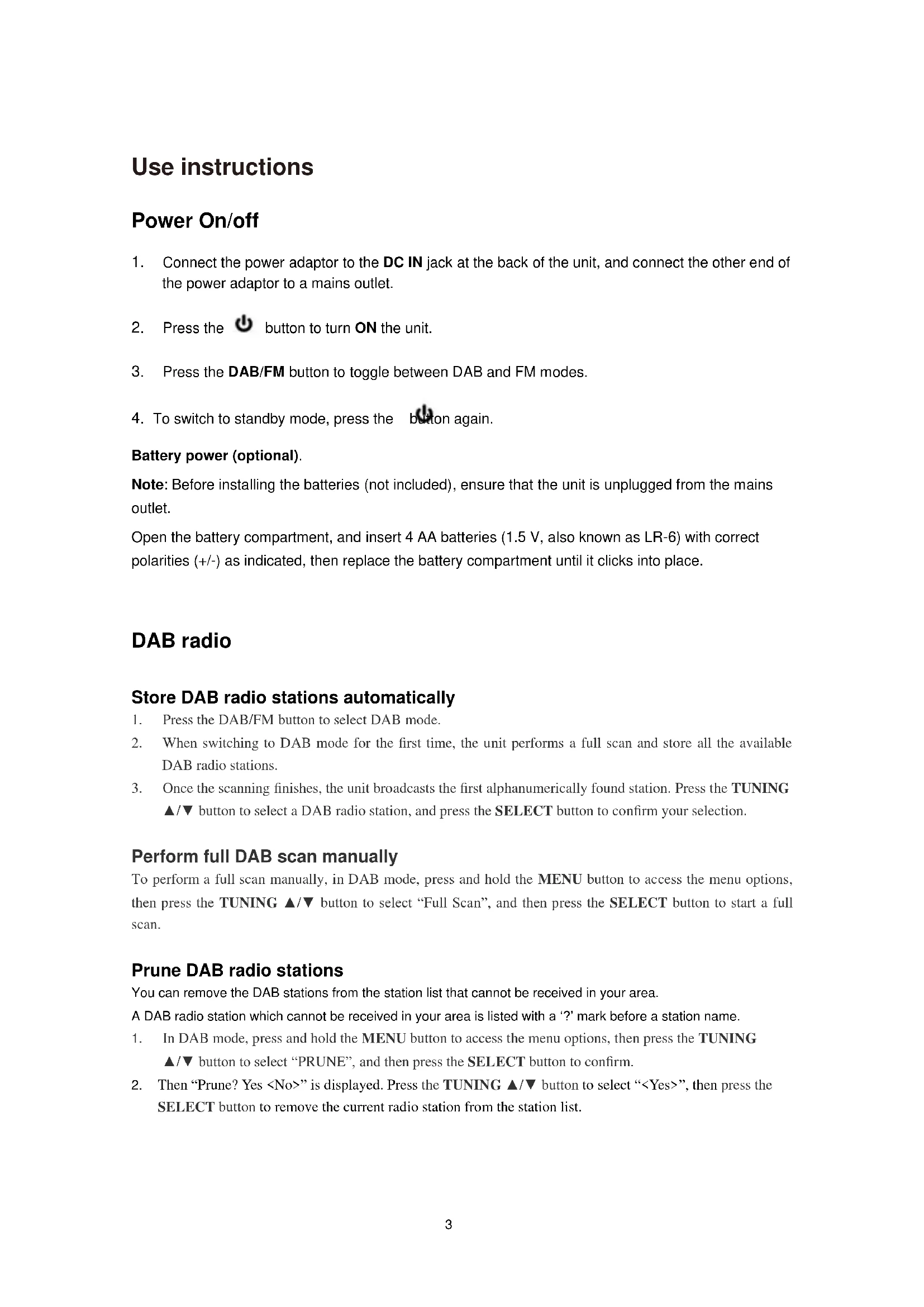 ▲/▼ button to select a DAB radio station, and press the SELECT button to confirm your selection. Perform full DAB scan manually To perform a full scan manually, in DAB mode, press and hold the MENU button to access the menu options, then press the TUNING ▲/▼ button to select “Full Scan”, and then press the SELECT button to start a full scan. Prune DAB radio stations You can remove the DAB stations from the station list that cannot be received in your area. A DAB radio station which cannot be received in your area is listed with a ‘?’ mark before a station name.