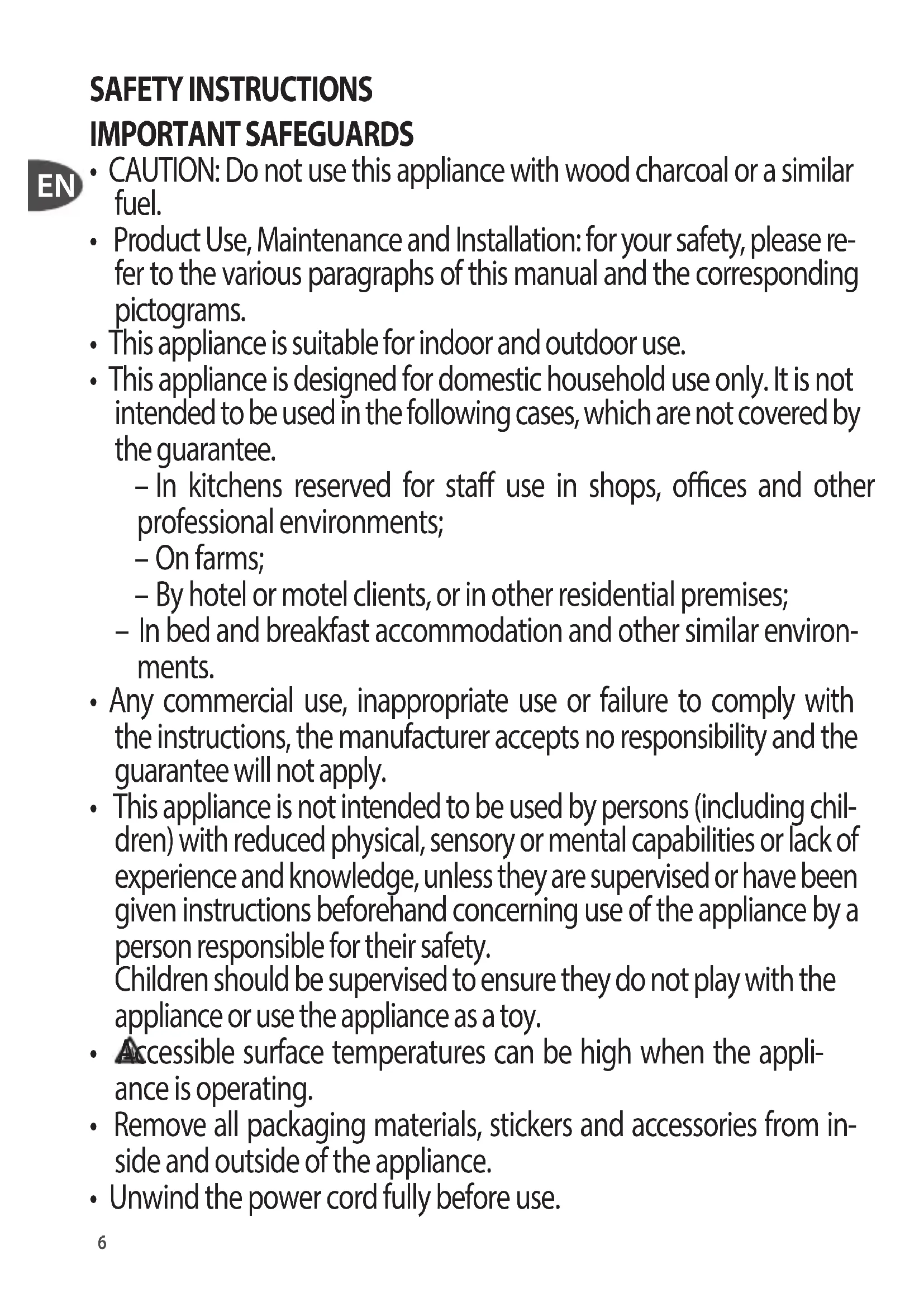 - Any commercial use, inappropriate use or failure to comply with the instructions, the manufacturer accepts no responsibility and the guarantee will not apply.