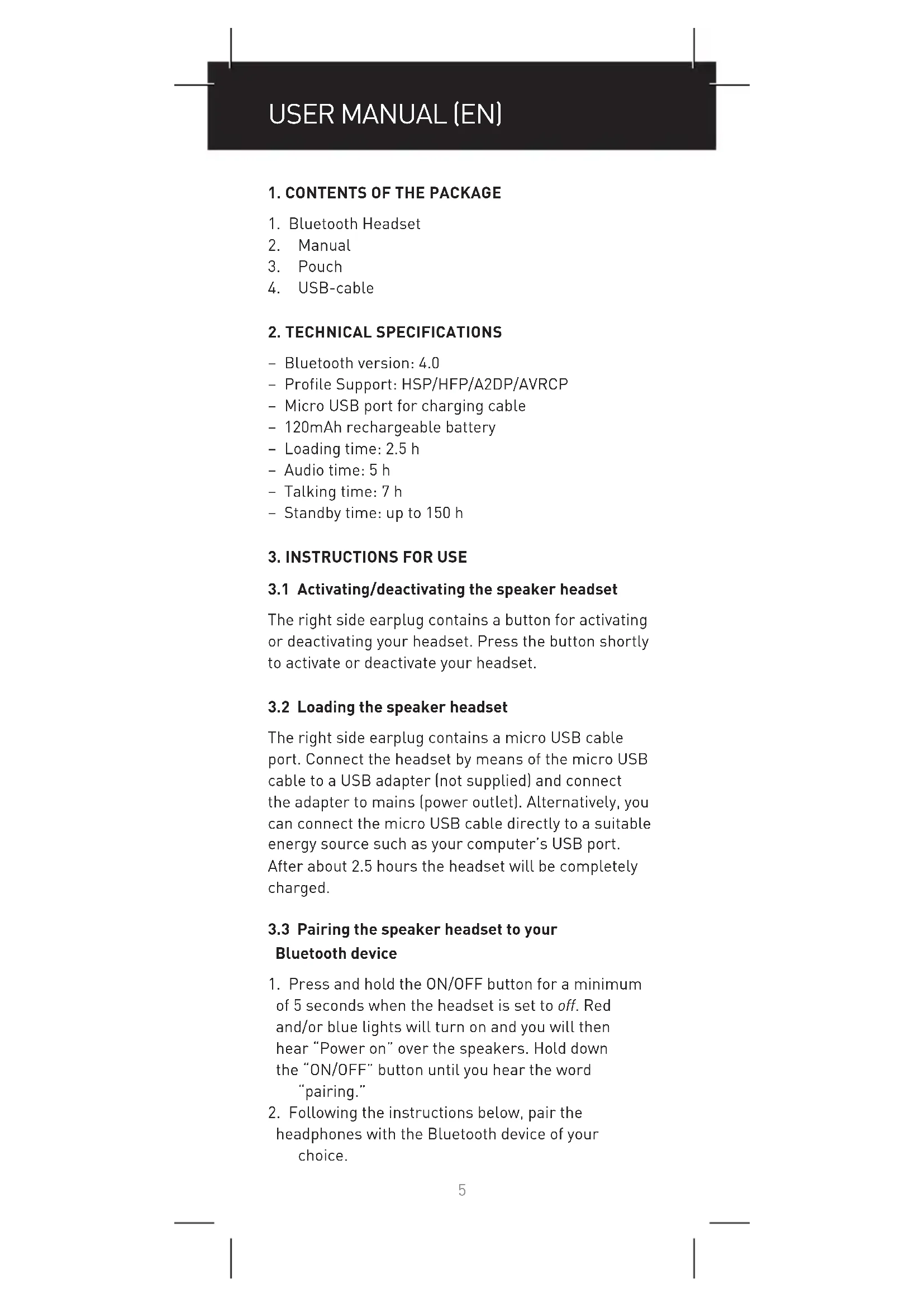 – Bluetooth version: 4.0 – Profile Support: HSP/HFP/A2DP/AVRCP – Micro USB port for charging cable – 120mAh rechargeable battery – Loading time: 2.5 h – Audio time: 5 h – Talking time: 7 h – Standby time: up to 150 h